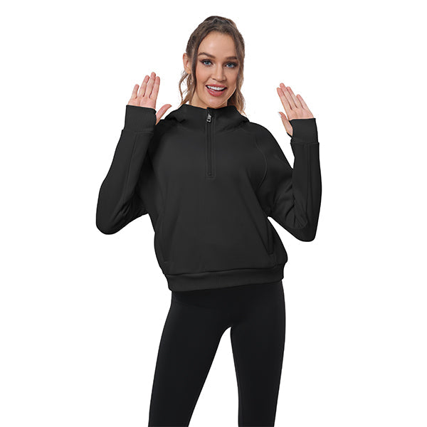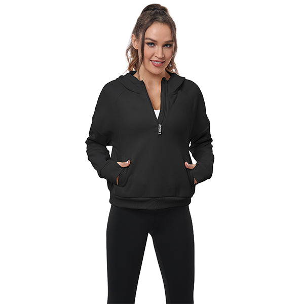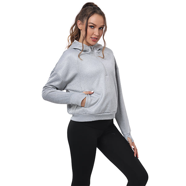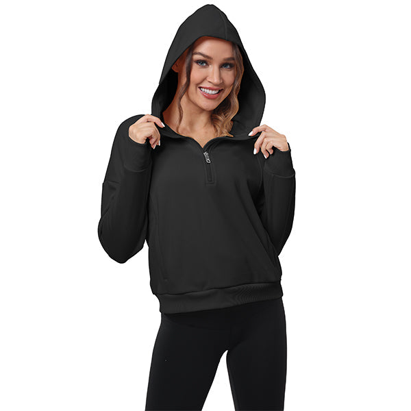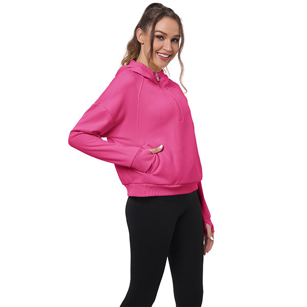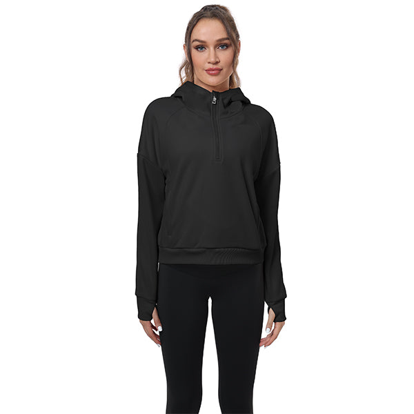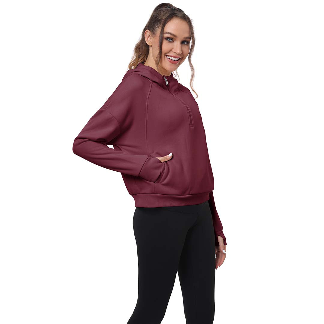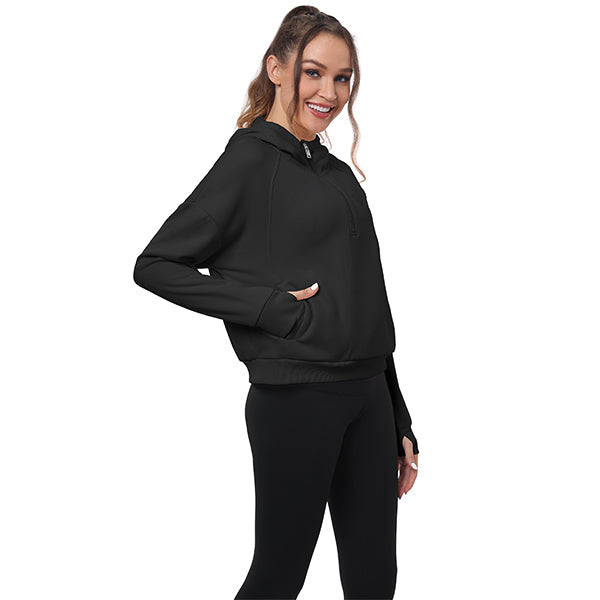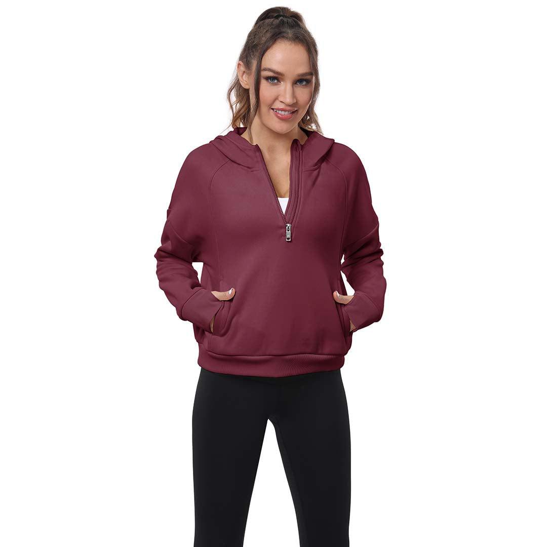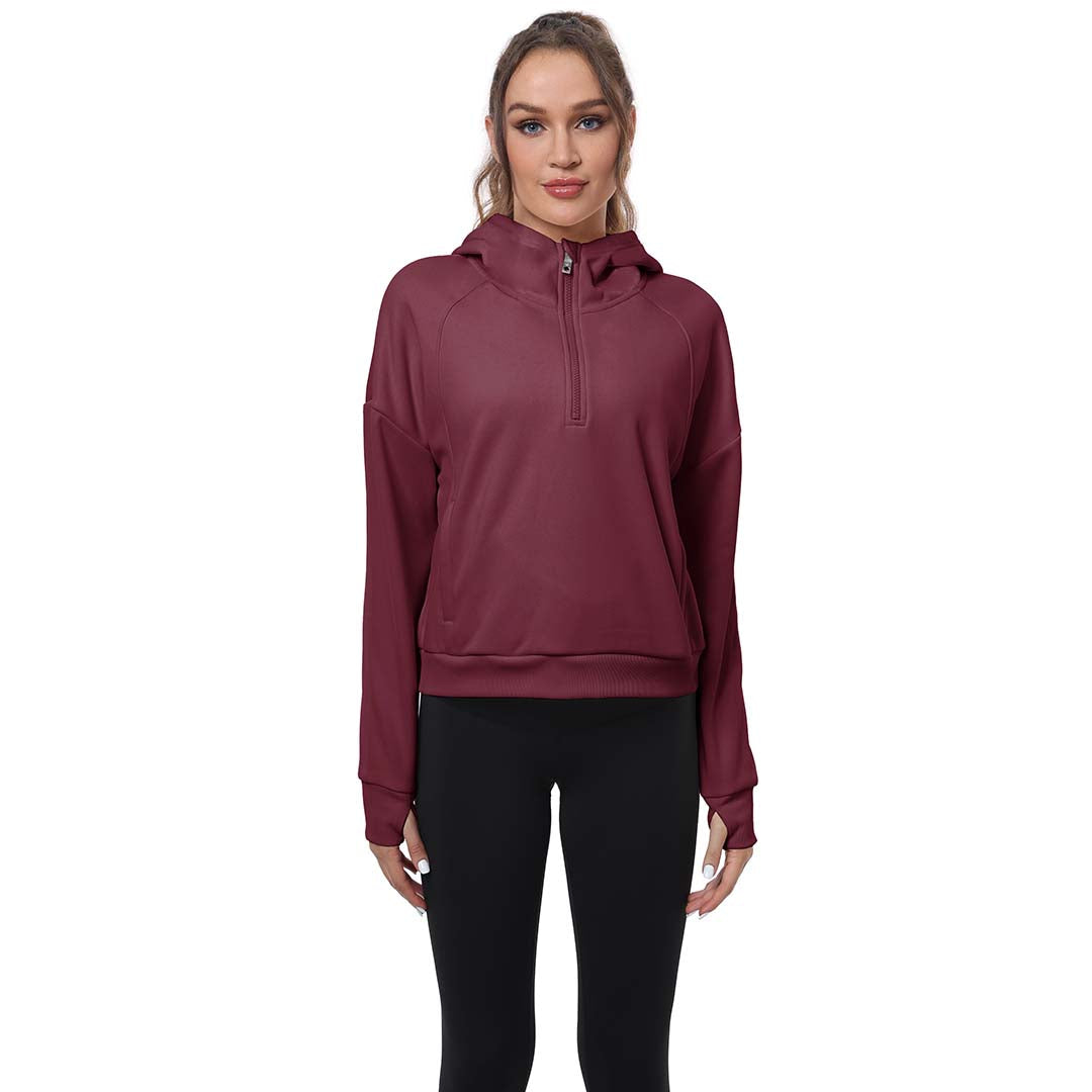 Athletic workout hoodies,women pullover sweatshirt,long sleeve with thumb hole ,1/2 zip up collar, solid color,cropped length,stand collar,fleece lined,2 insert pockets,relaxed fit,crop top