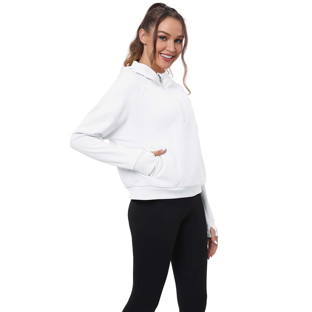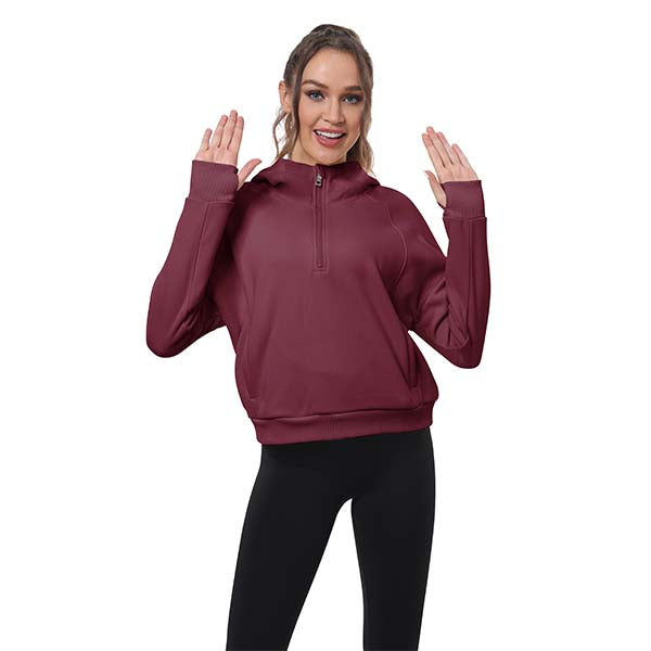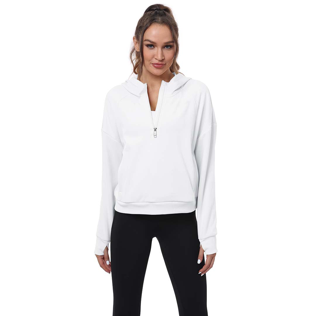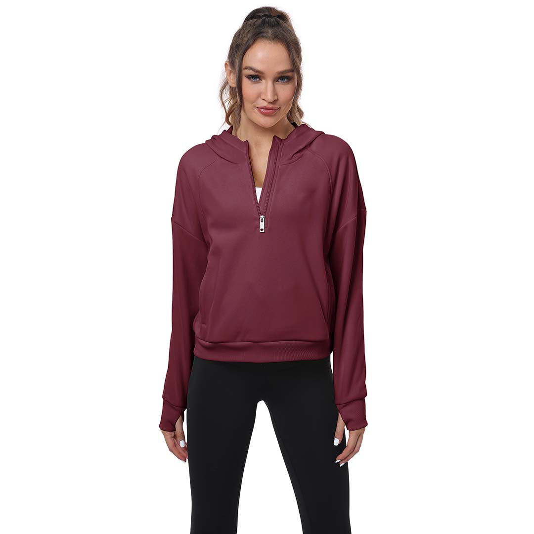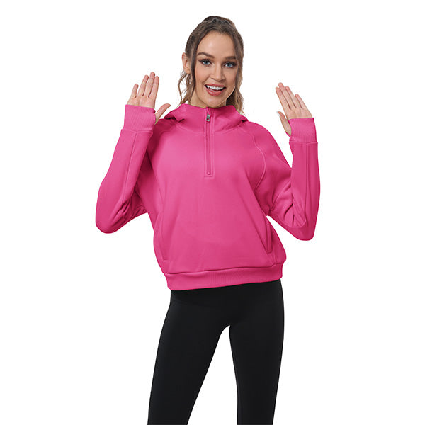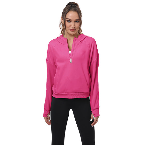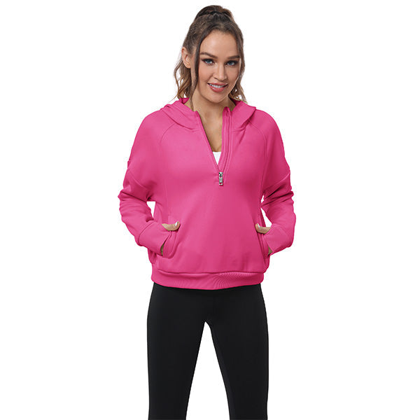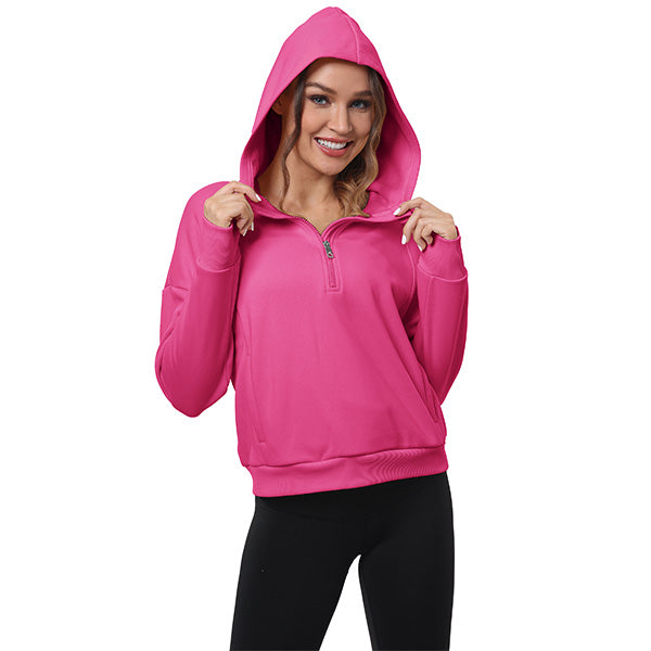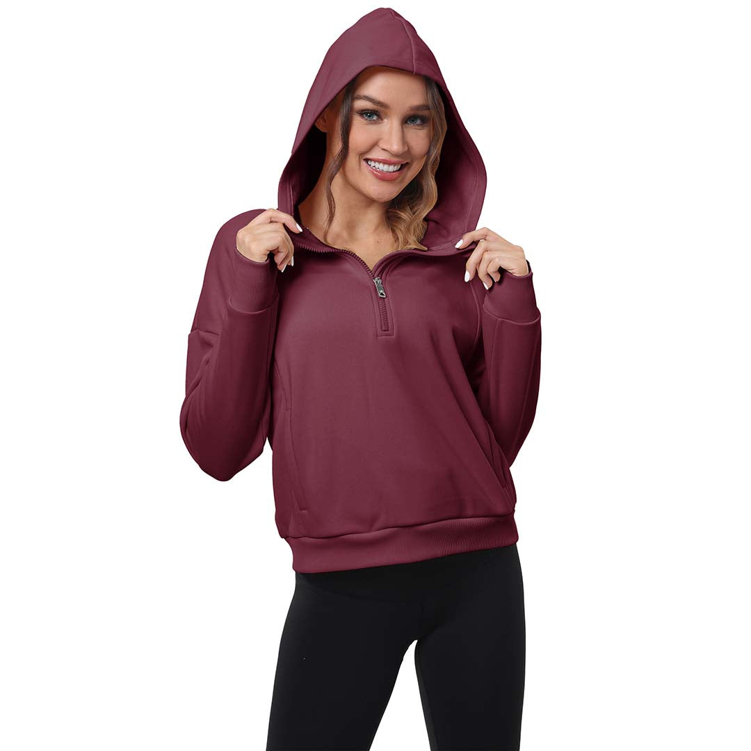 Athletic workout hoodies,women pullover sweatshirt,long sleeve with thumb hole ,1/2 zip up collar, solid color,cropped length,stand collar,fleece lined,2 insert pockets,relaxed fit,crop top