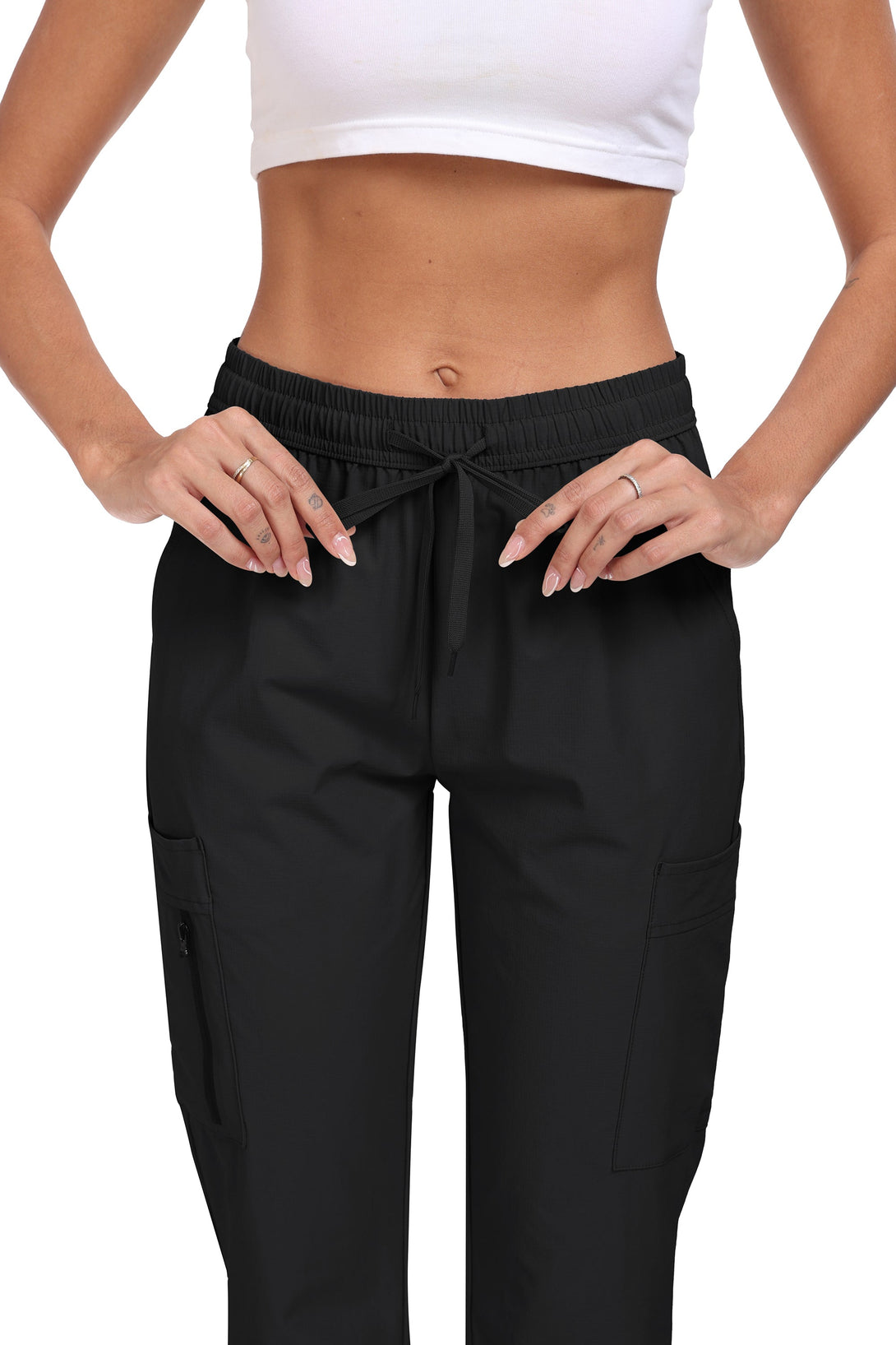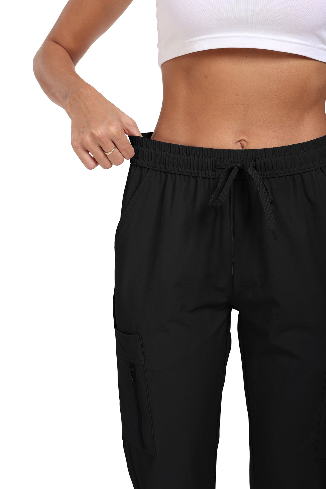 elastic, adjustable drawstring, 1 hidden zip pocket and headphone cable hole at the waist