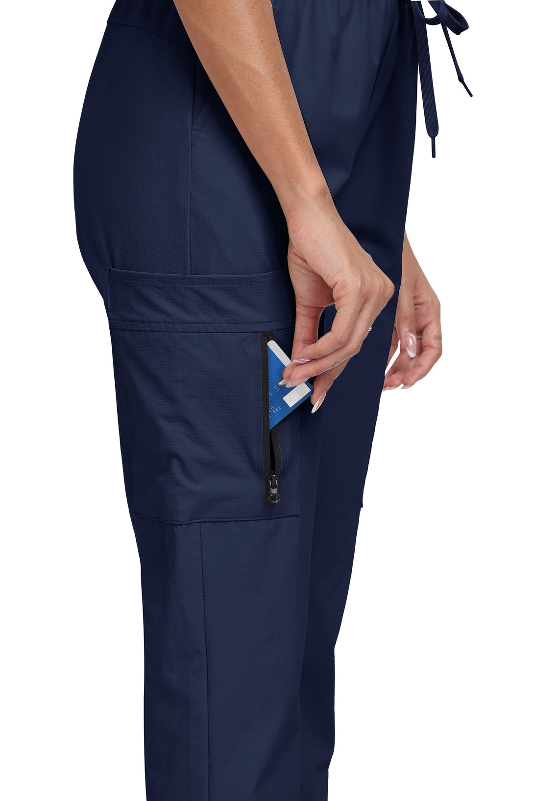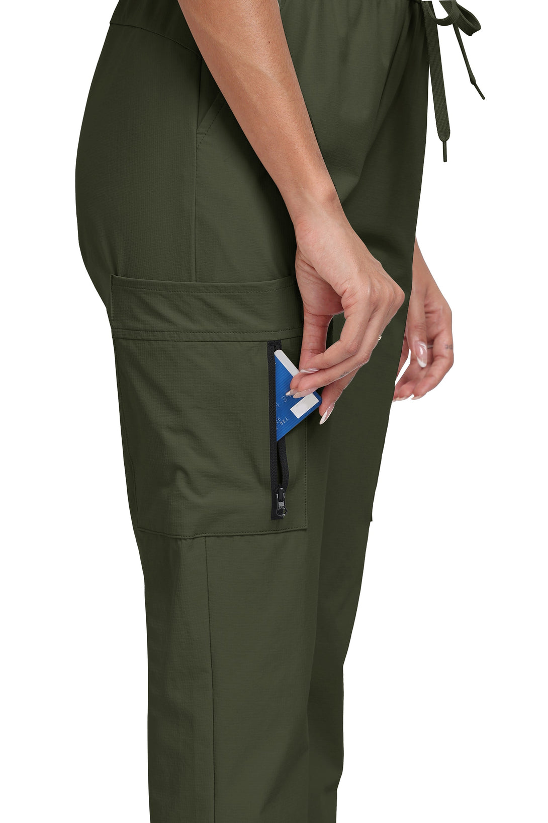 side pockets, 2 overlapping pockets and 1 zip pocket on the right side of the thigh, 2 overlapping pockets on the left side
