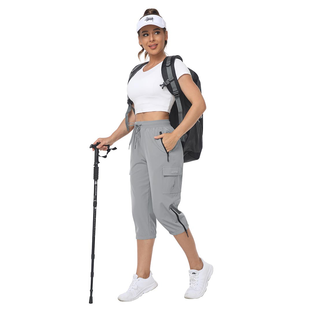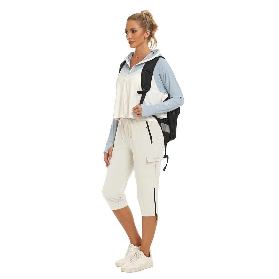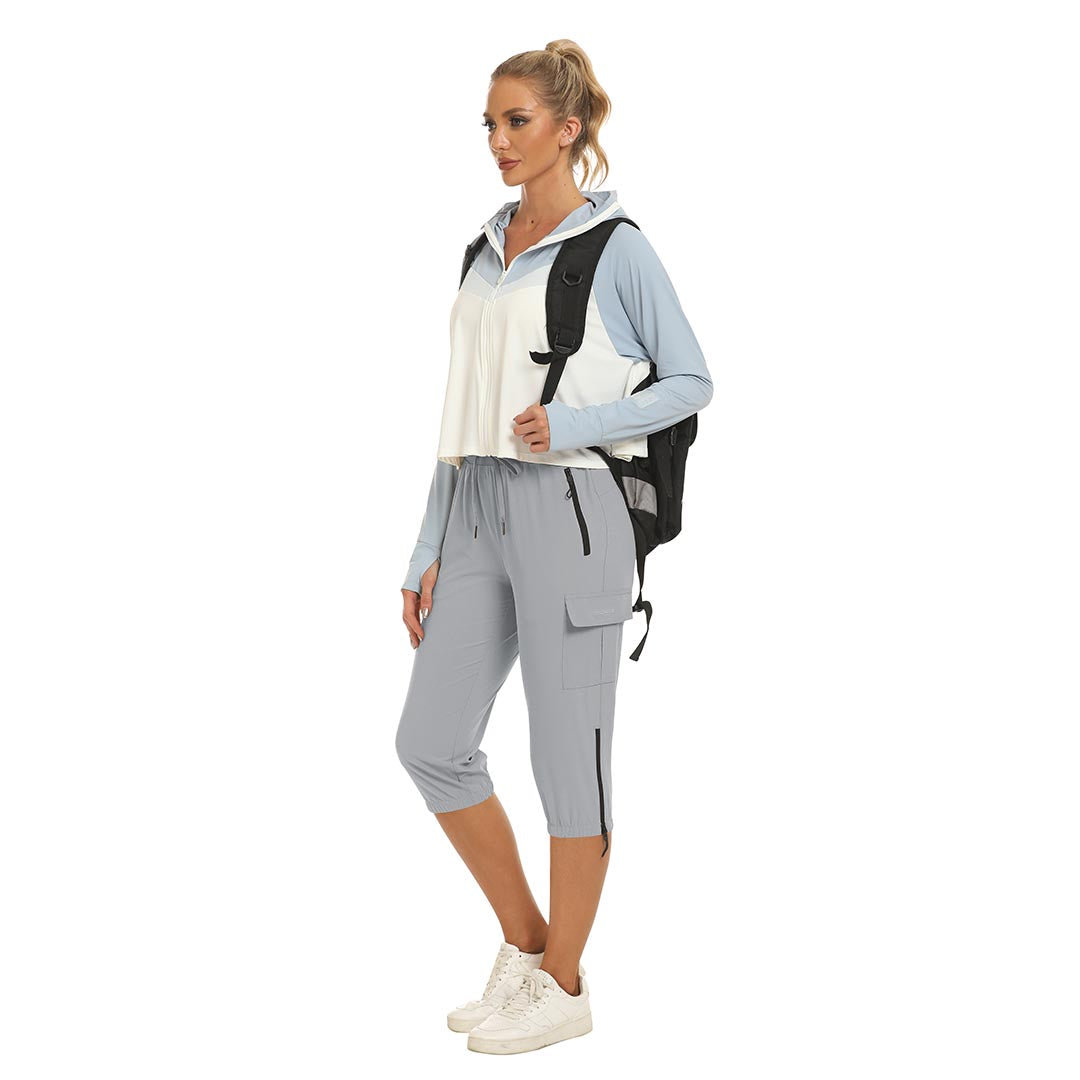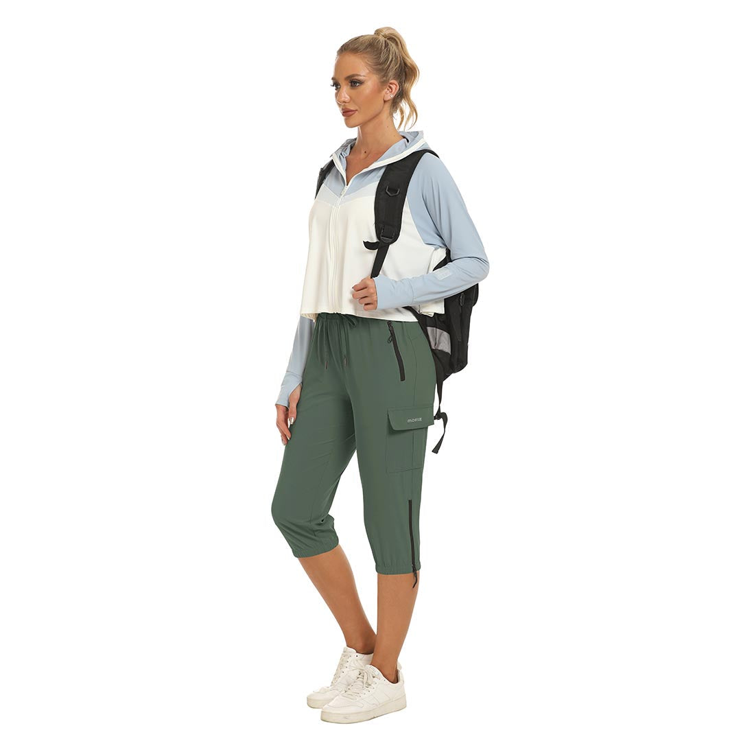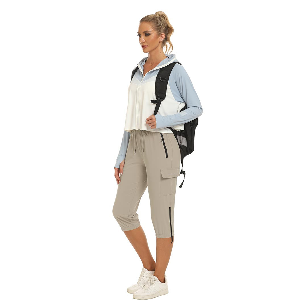 Women's outdoor capri pants feature an adjustable zipper around the foot opening to keep bugs out when hiking outdoors.