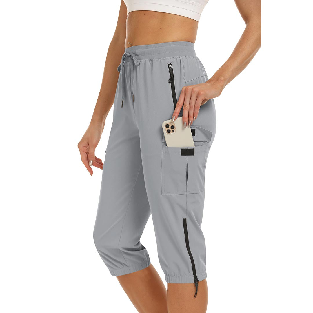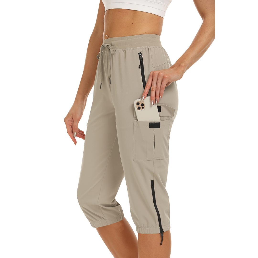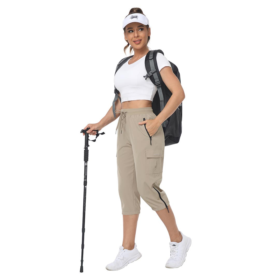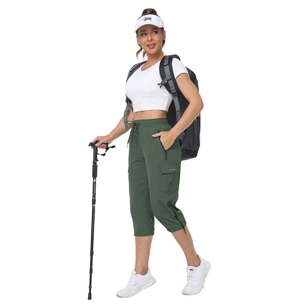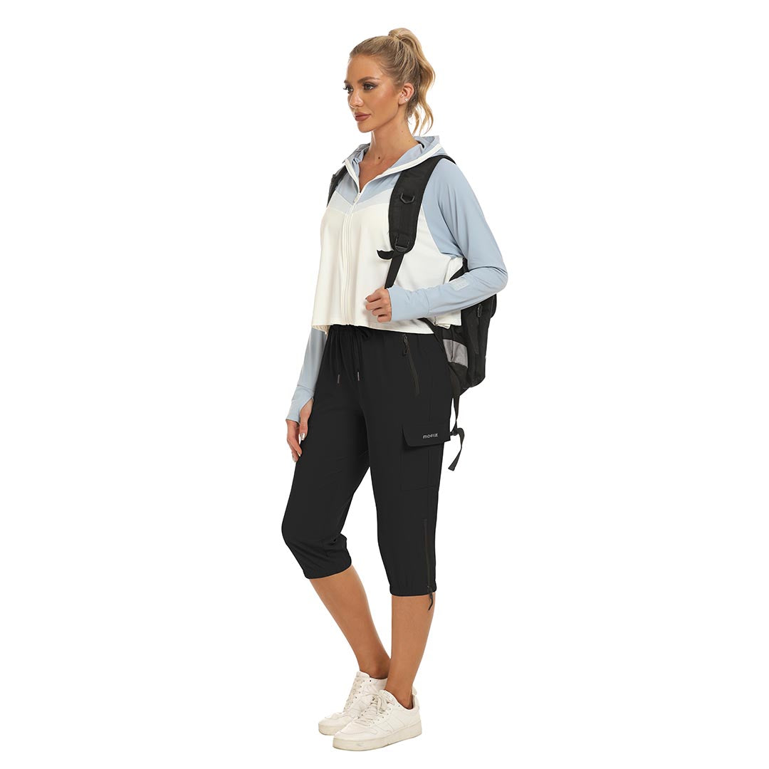 Women's outdoor capri pants feature an adjustable zipper around the foot opening to keep bugs out when hiking outdoors.