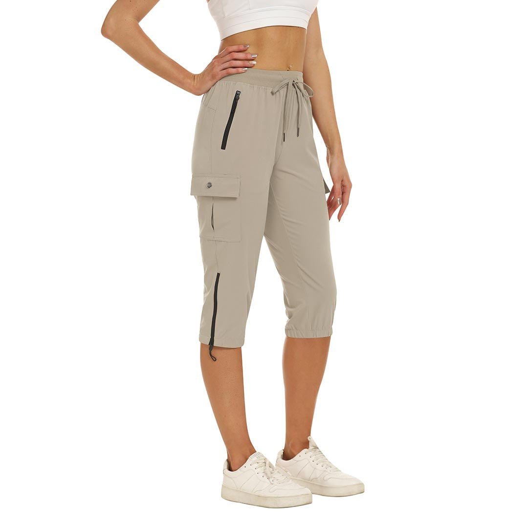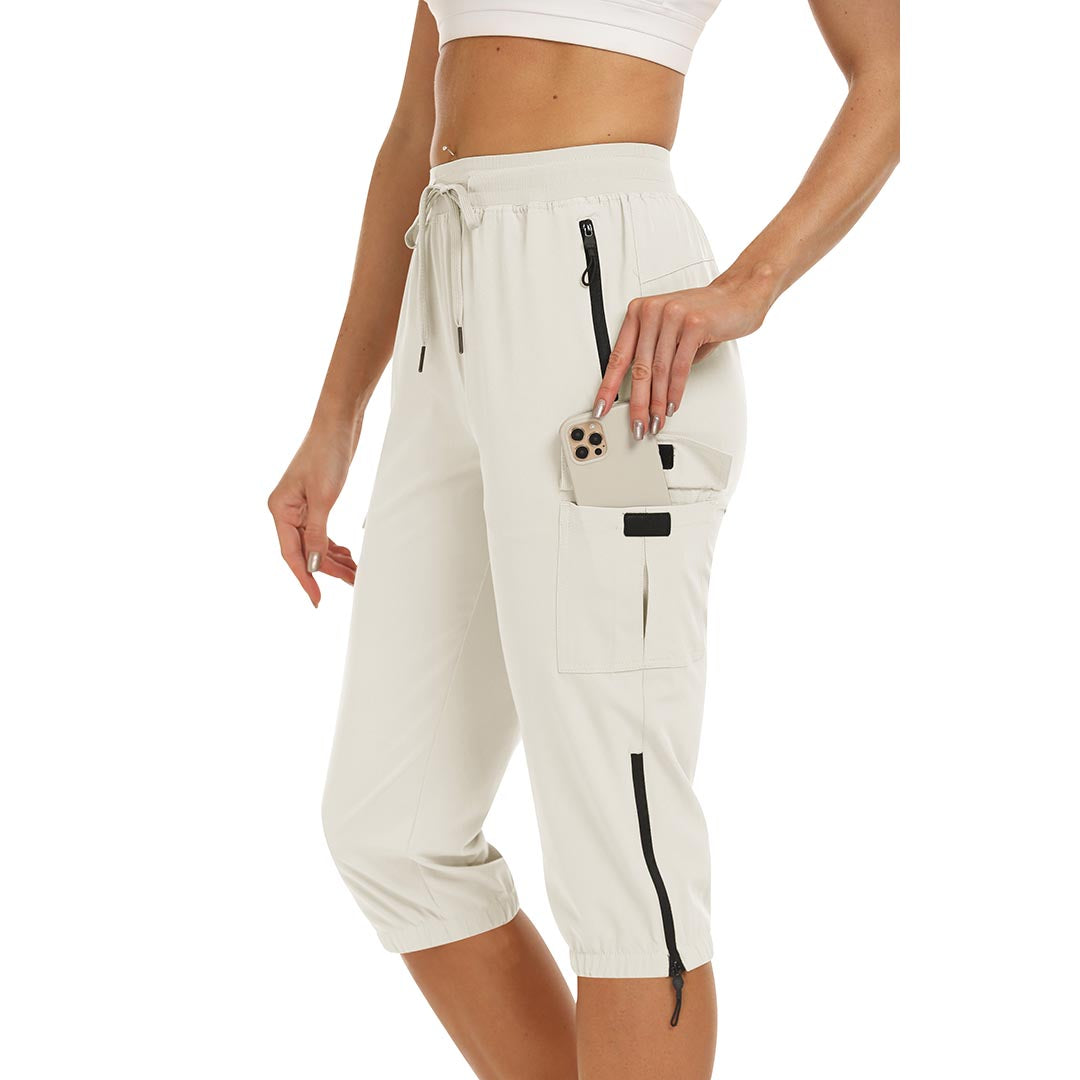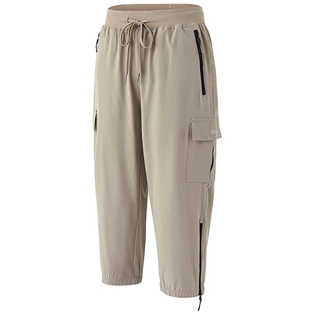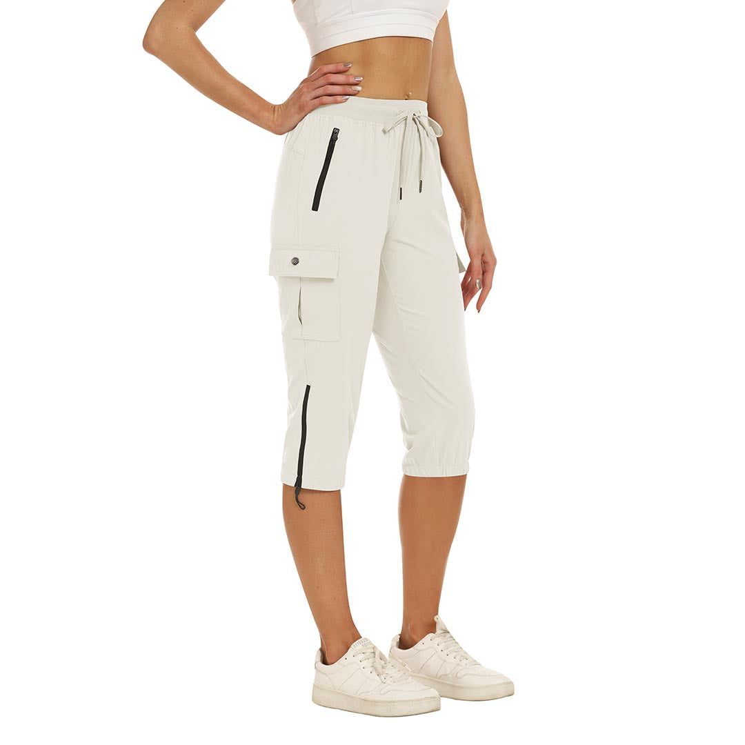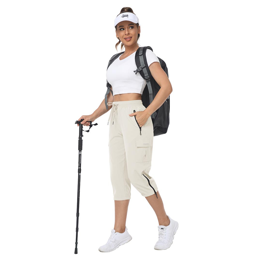 Women's outdoor capri pants feature an adjustable zipper around the foot opening to keep bugs out when hiking outdoors.