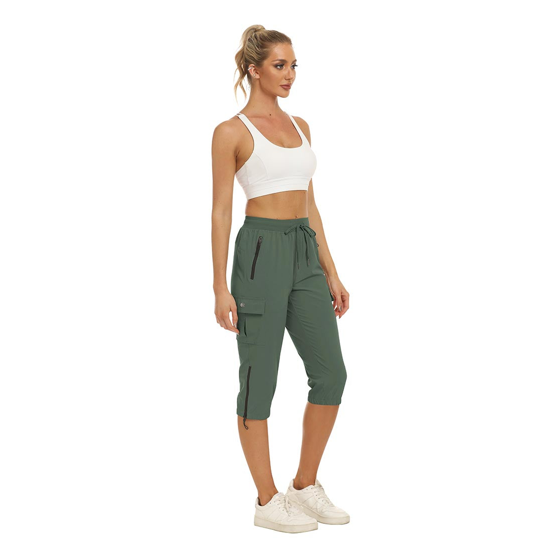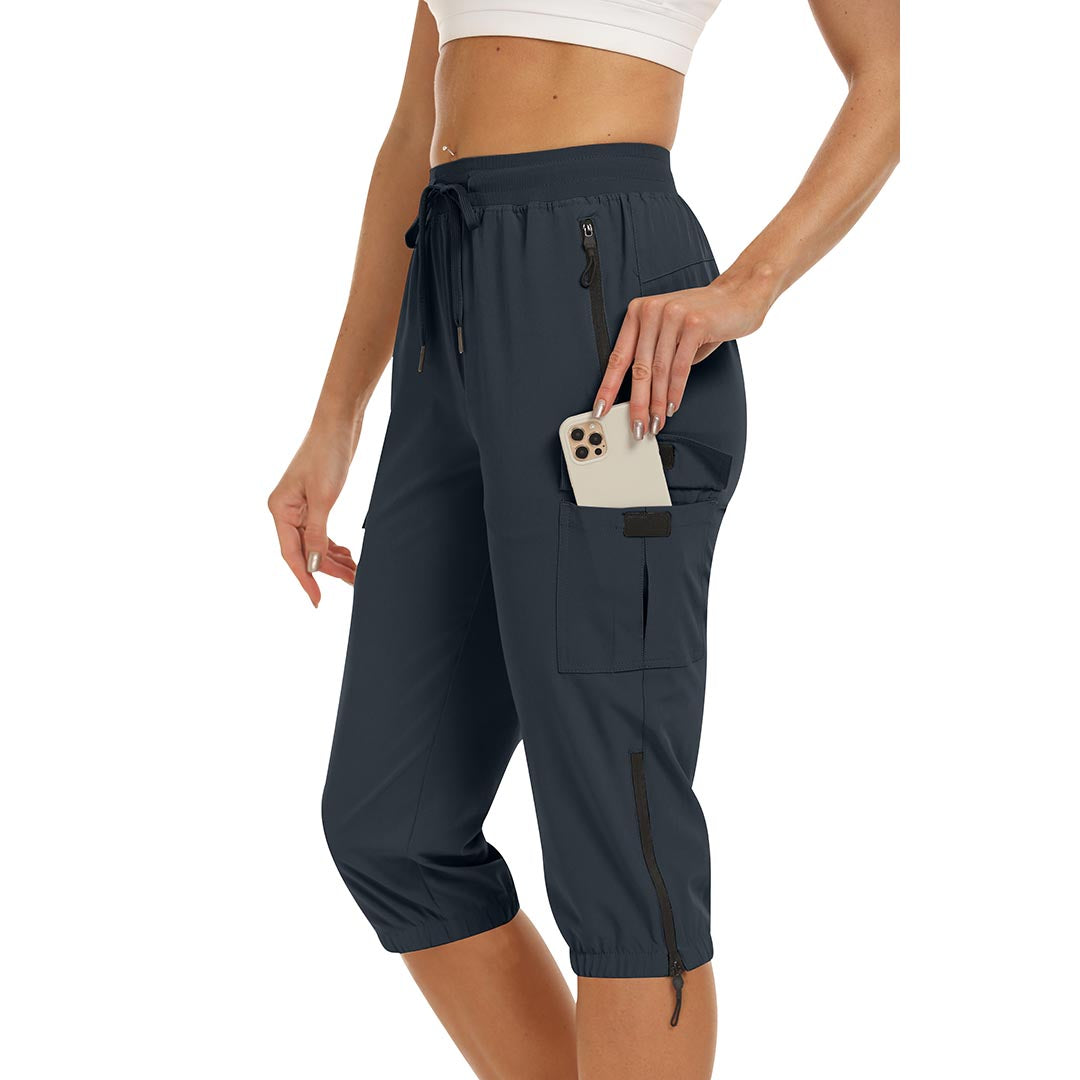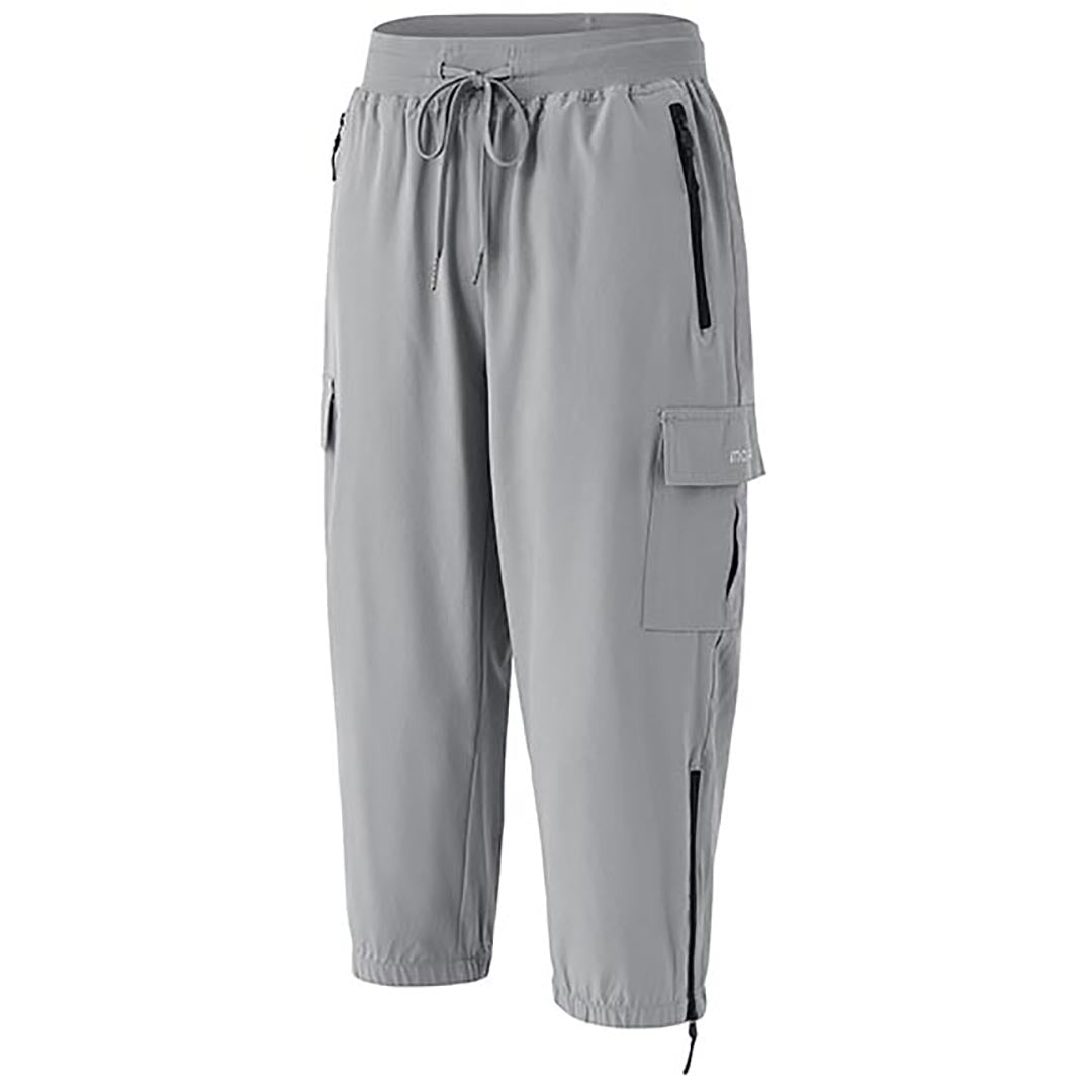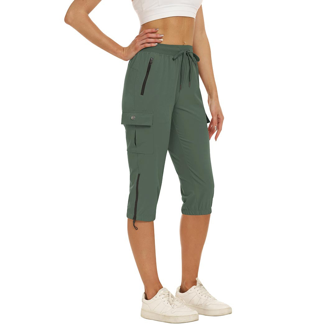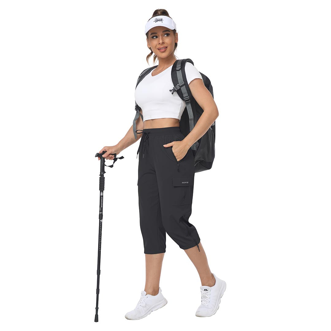 Women's outdoor capri pants feature an adjustable zipper around the foot opening to keep bugs out when hiking outdoors.