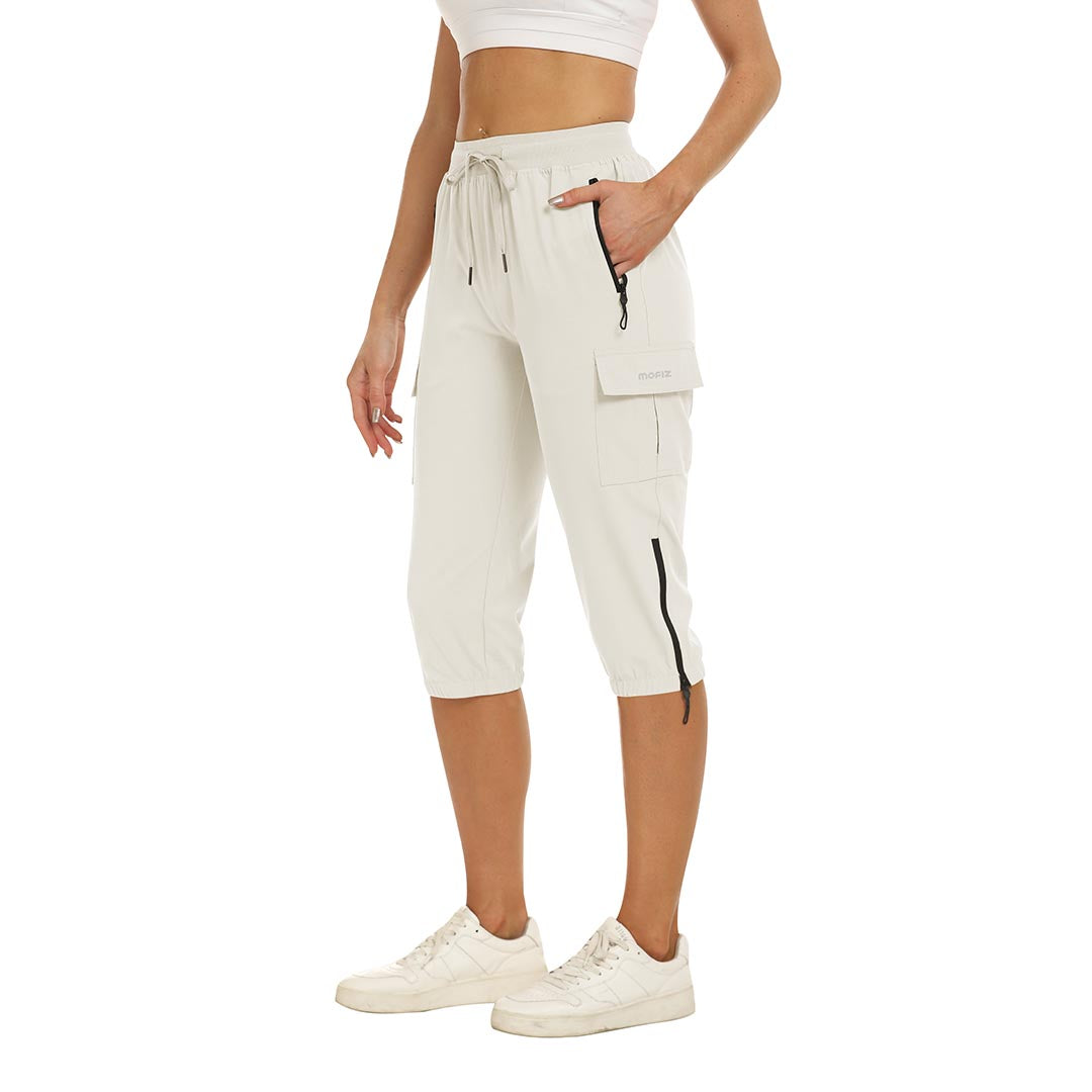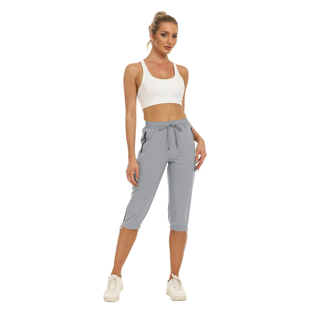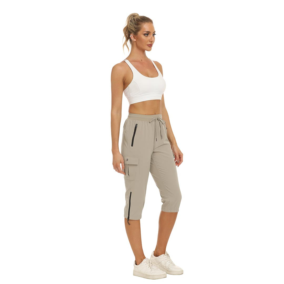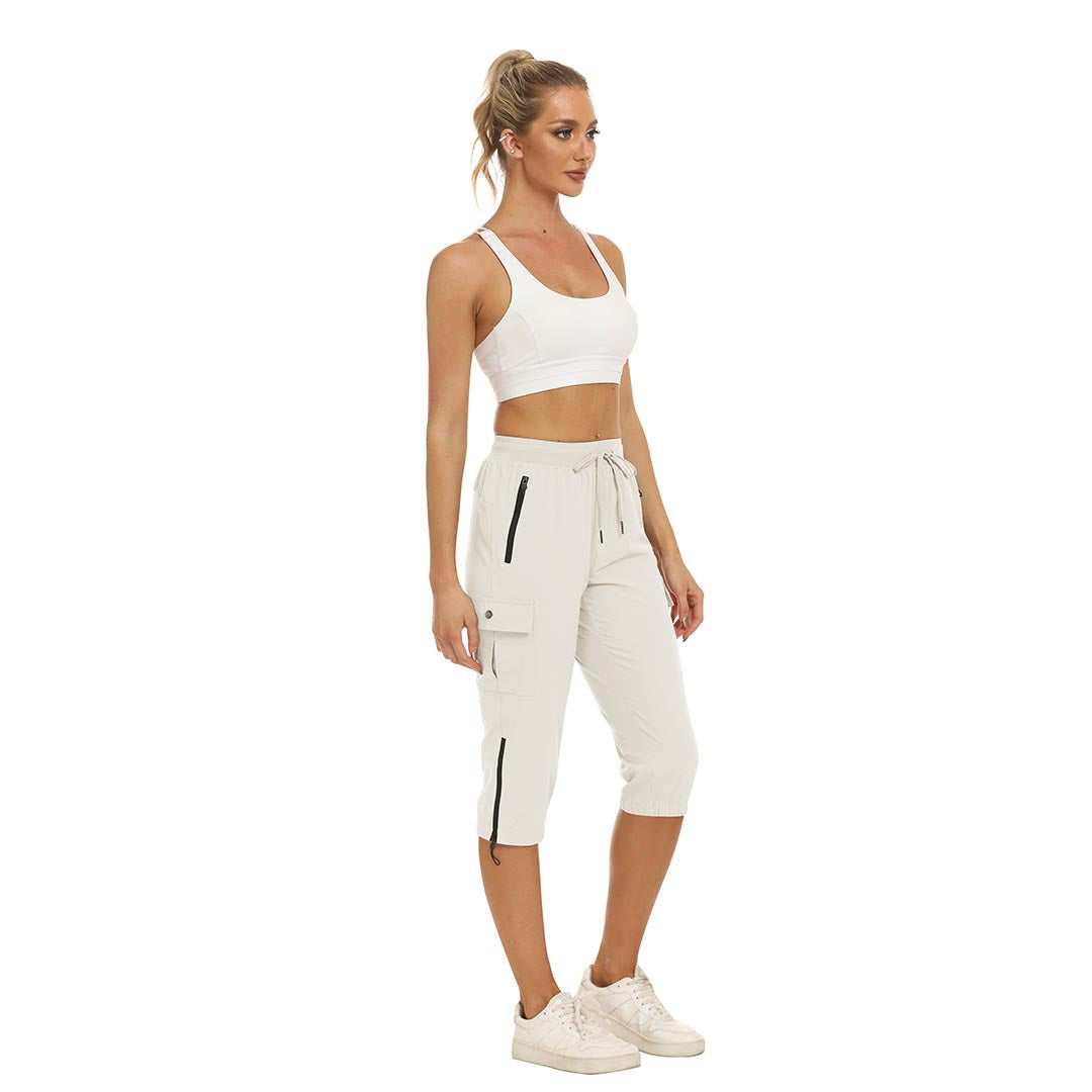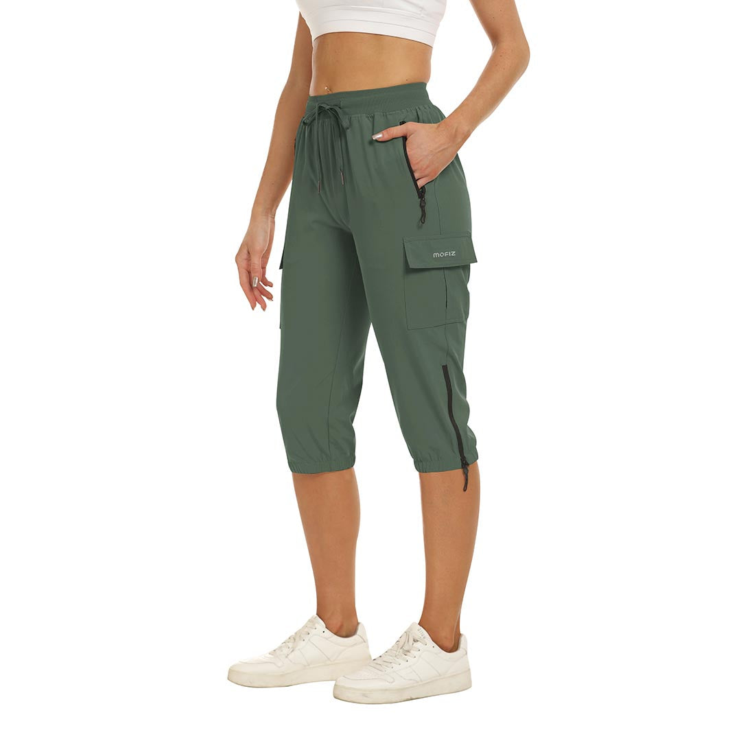 Women's outdoor capri pants feature an adjustable zipper around the foot opening to keep bugs out when hiking outdoors.