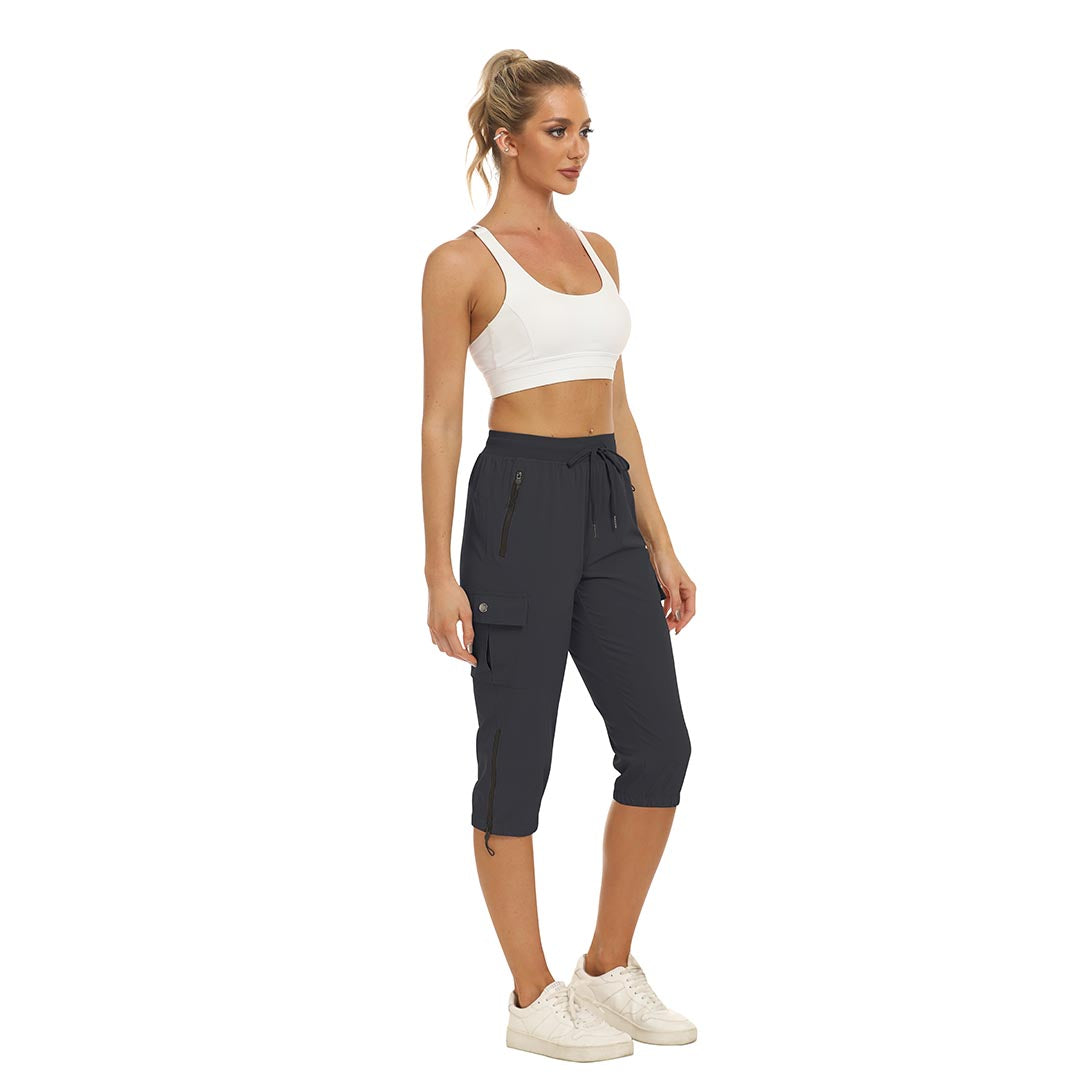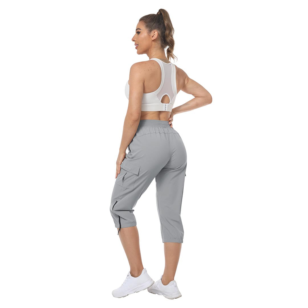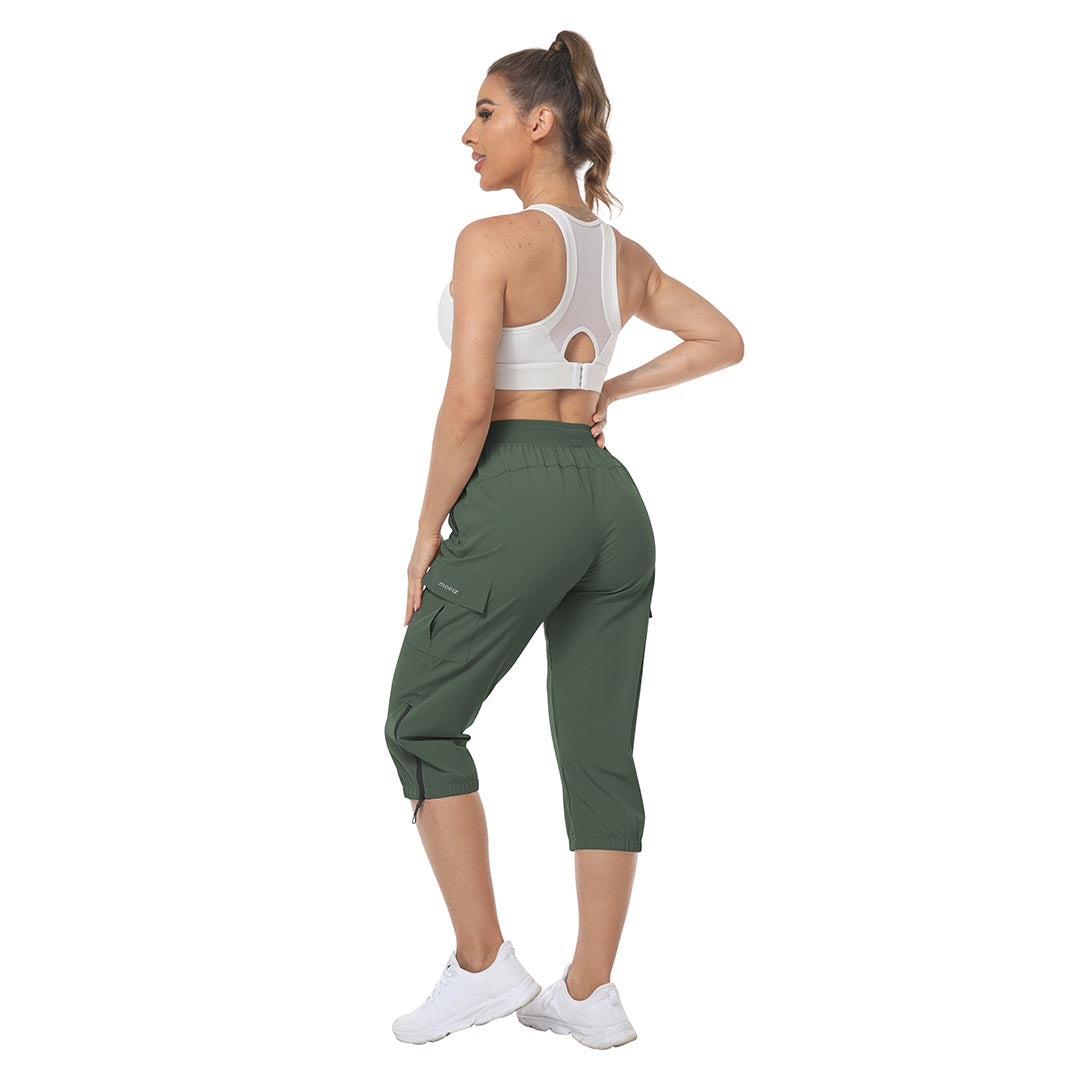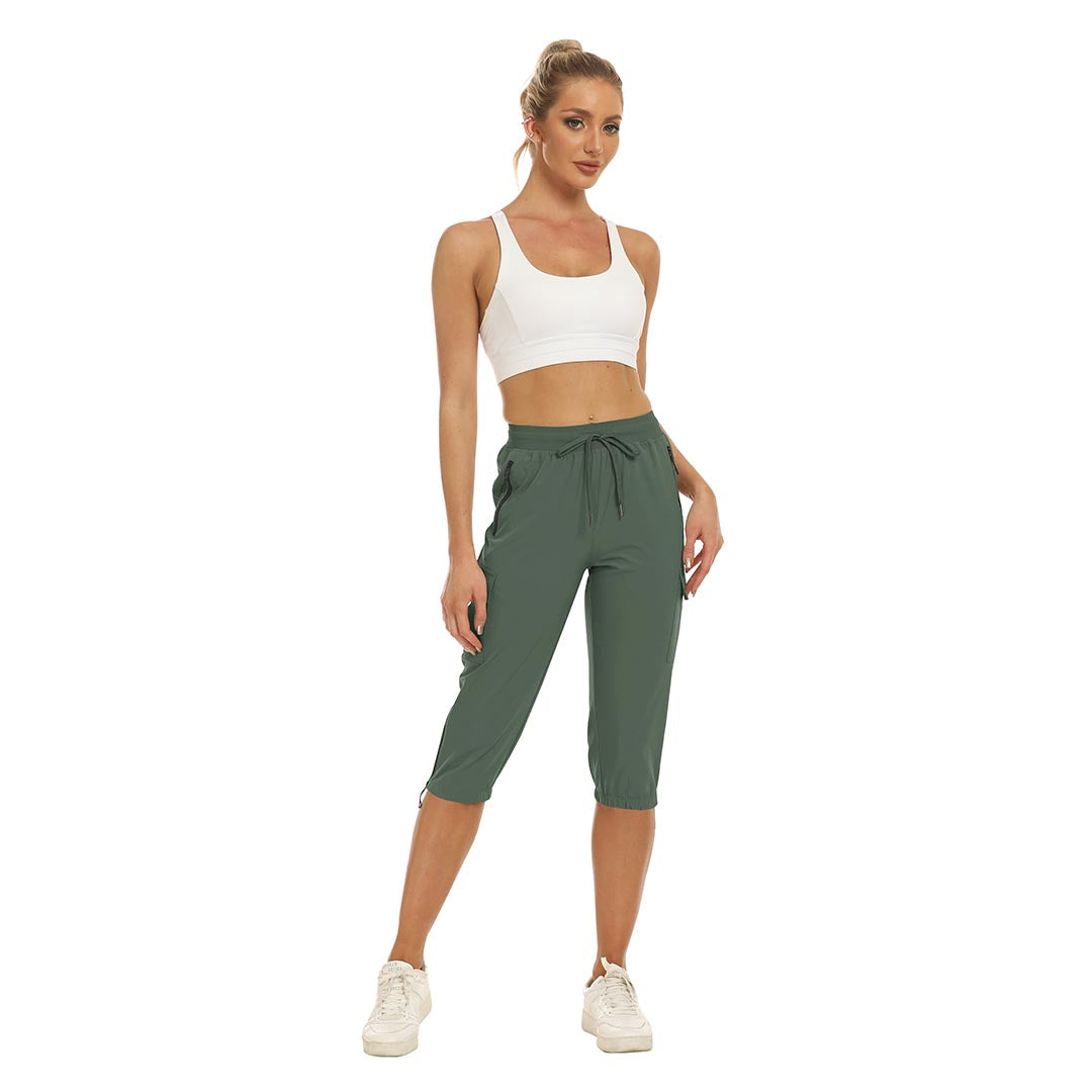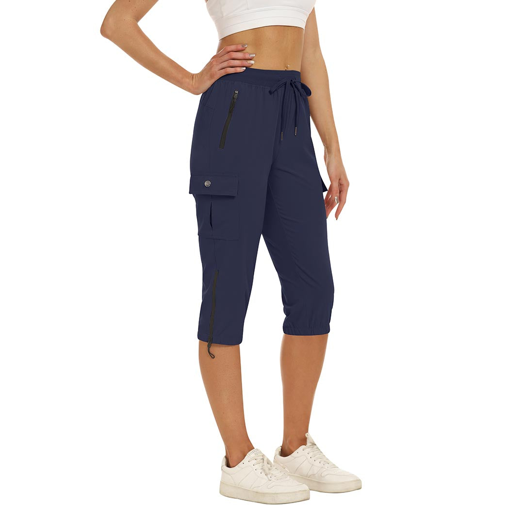 Women's outdoor capri pants feature an adjustable zipper around the foot opening to keep bugs out when hiking outdoors.