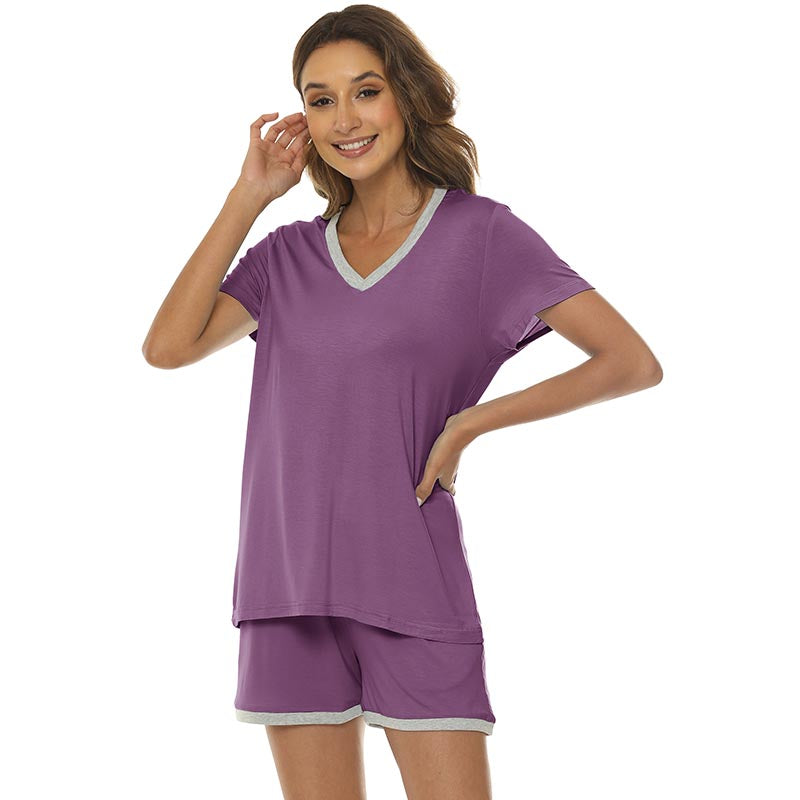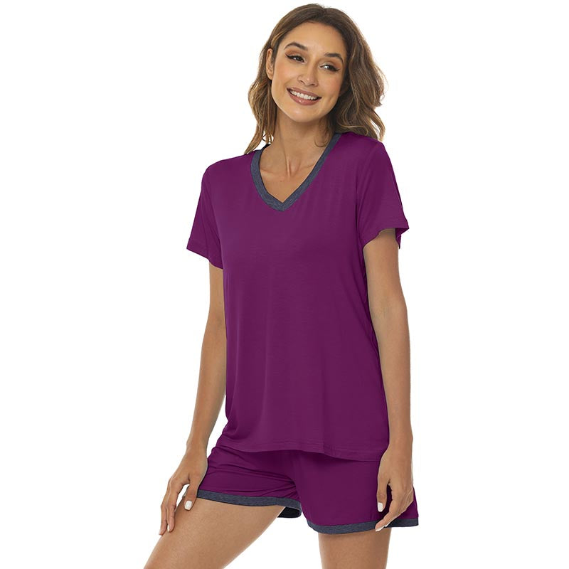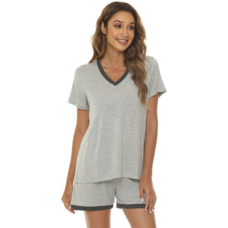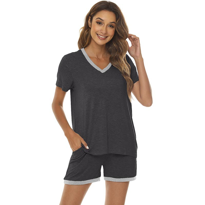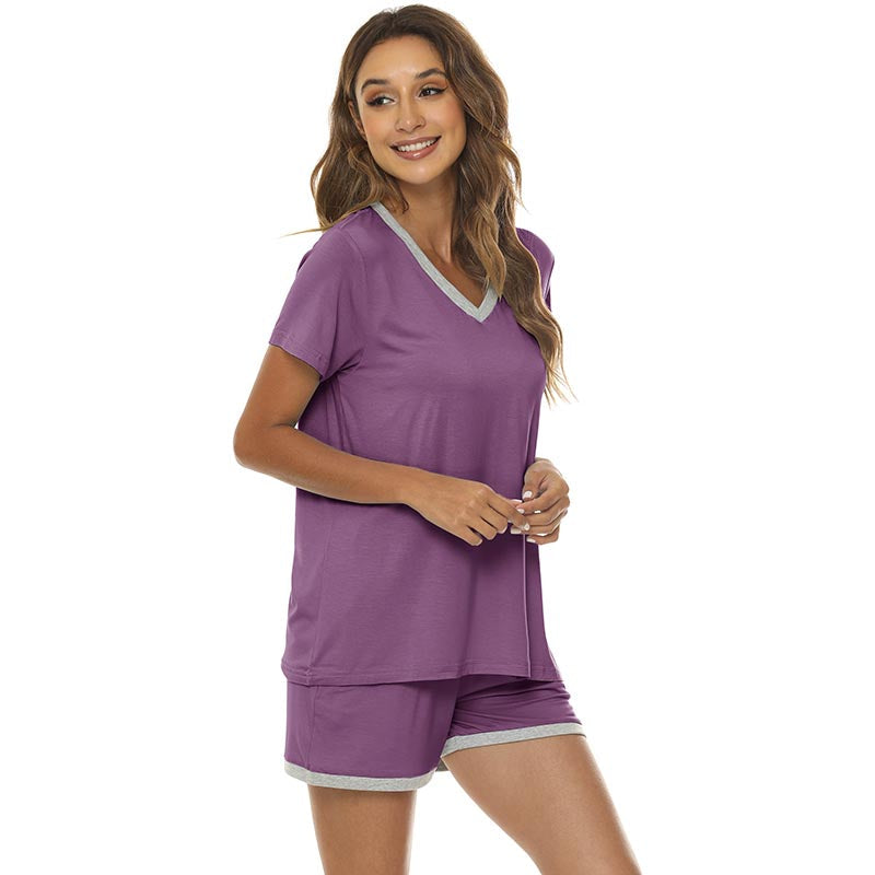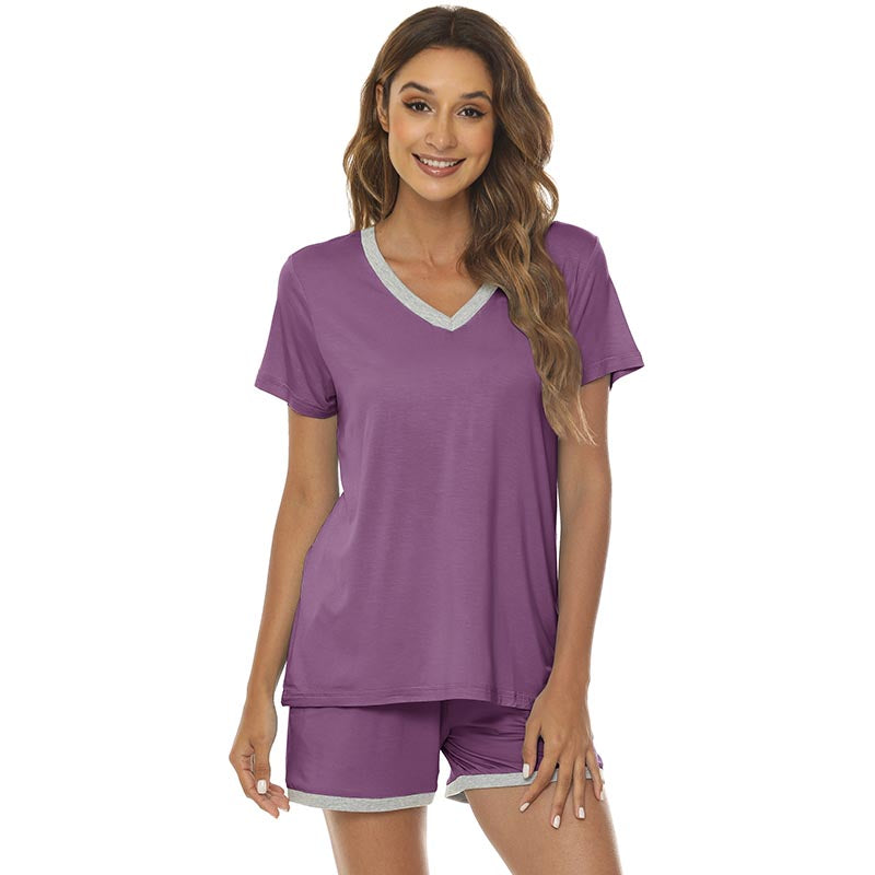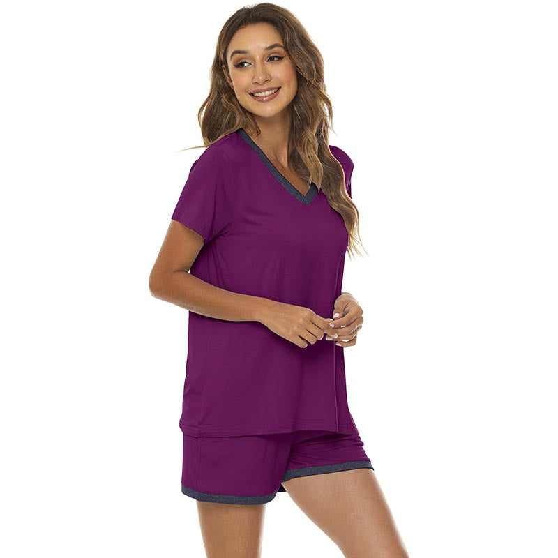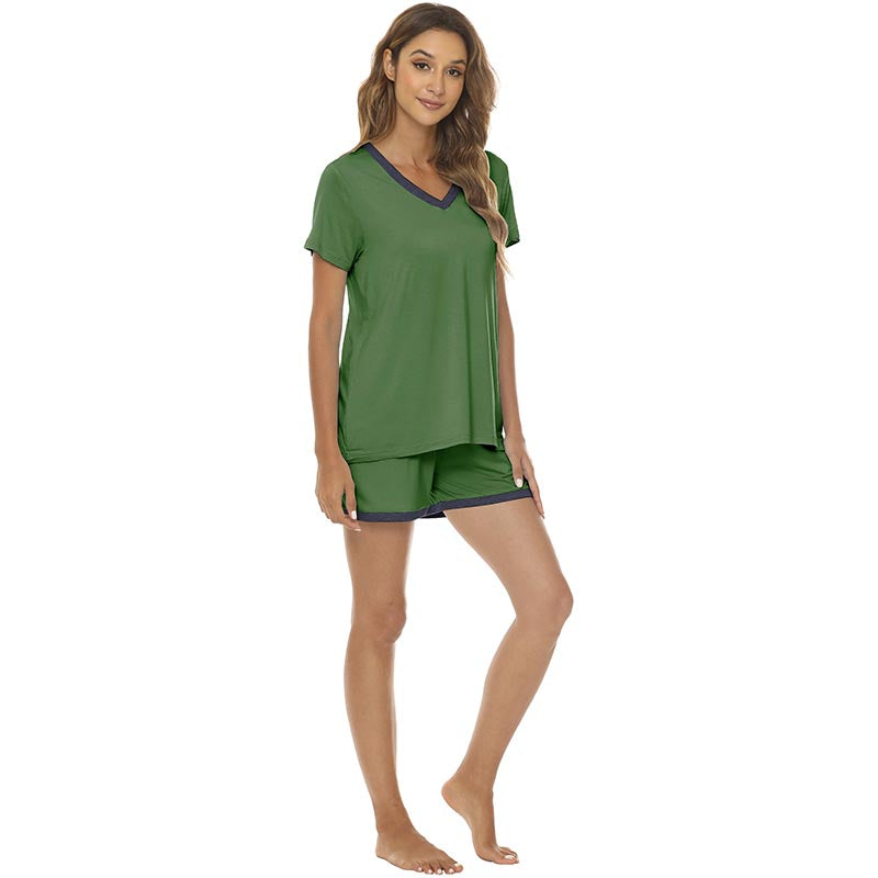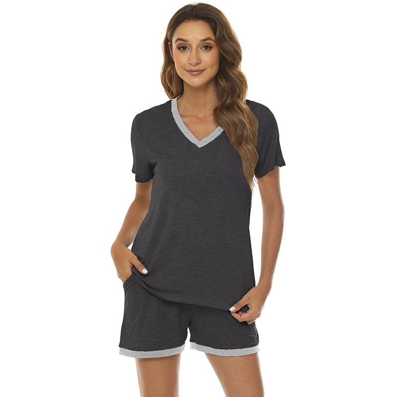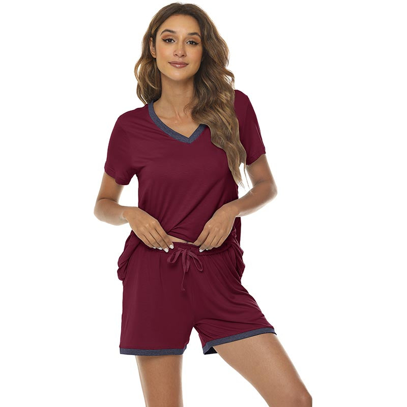 V-neck short sleeve pajama top with elastic waistband solid color capri pant with two pockets.