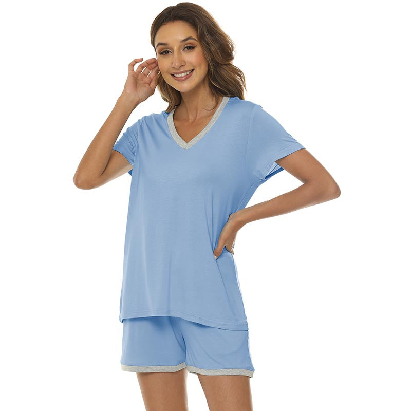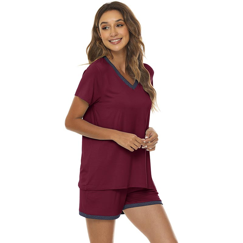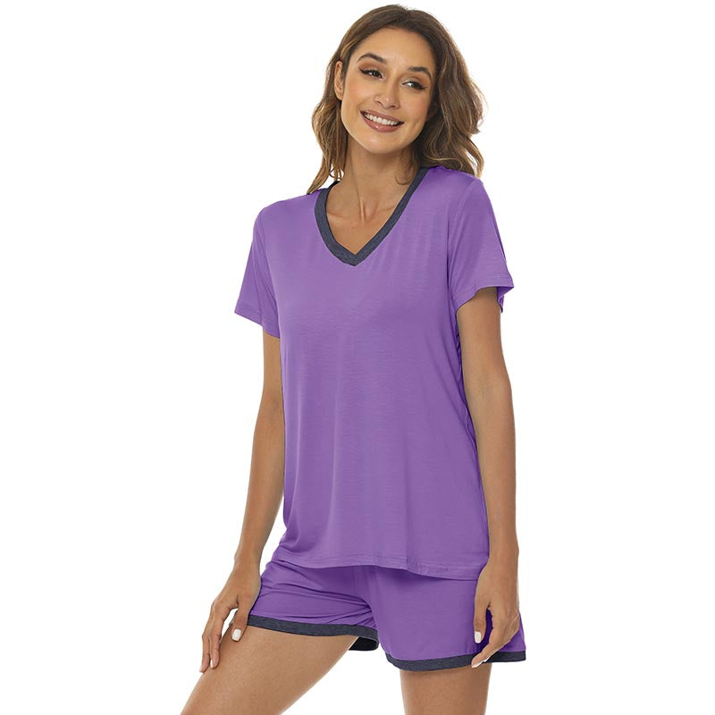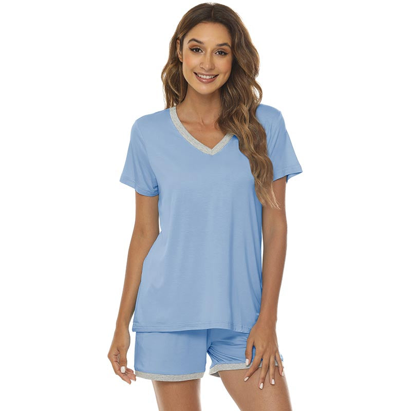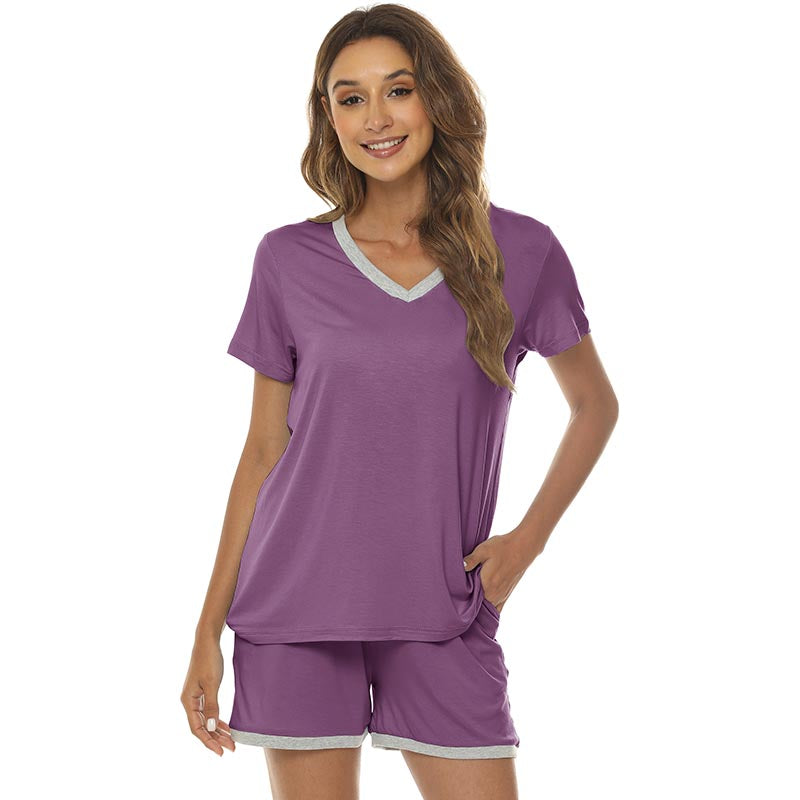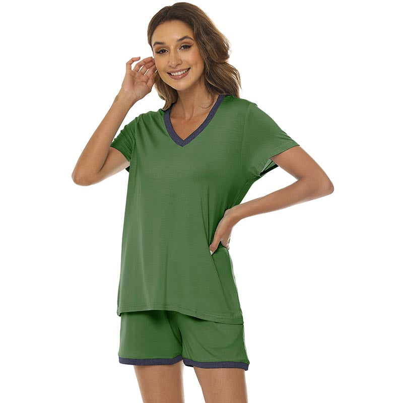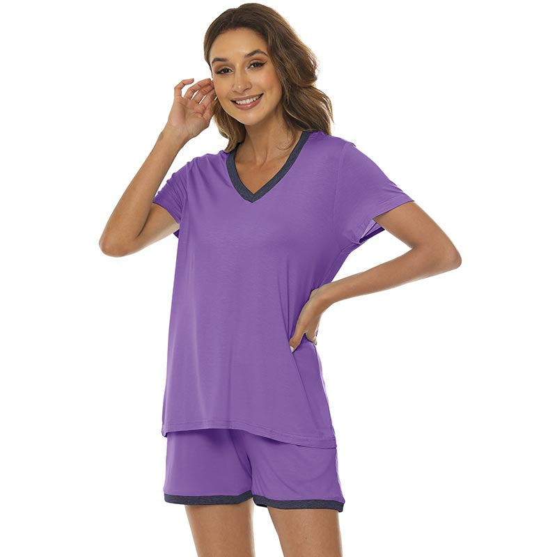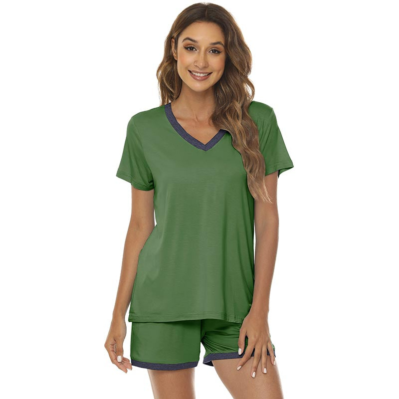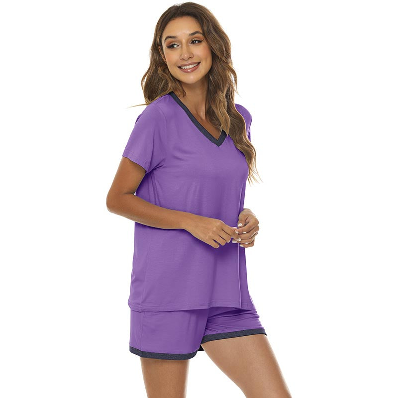 V-neck short sleeve pajama top with elastic waistband solid color capri pant with two pockets.
