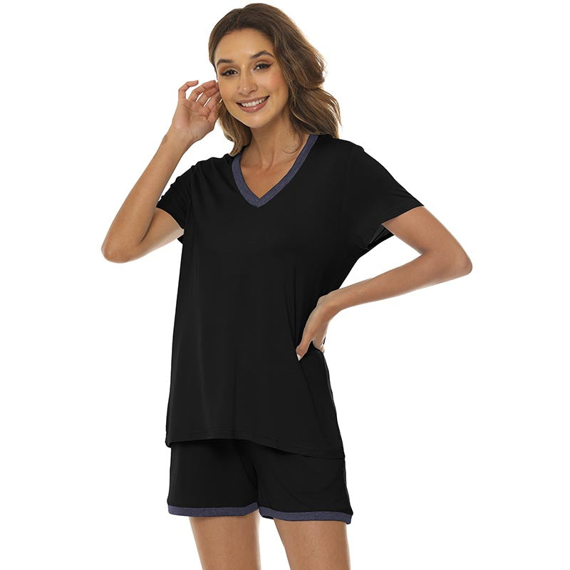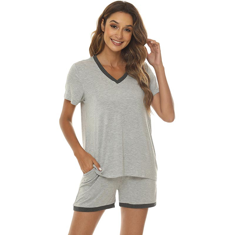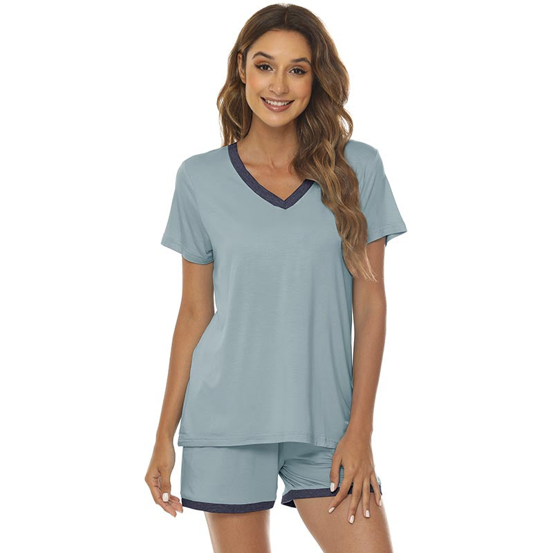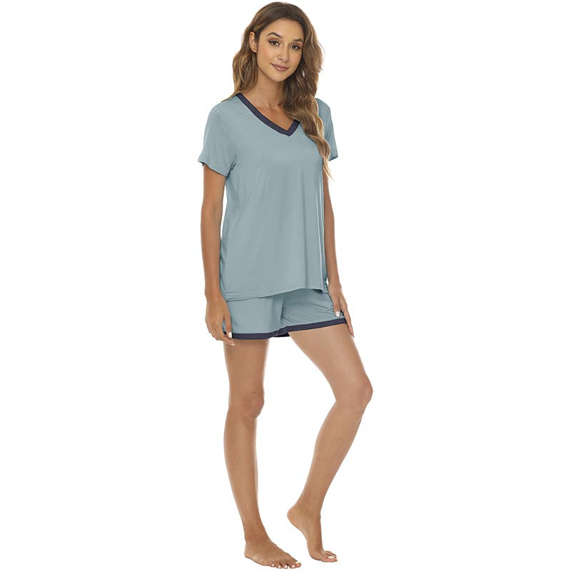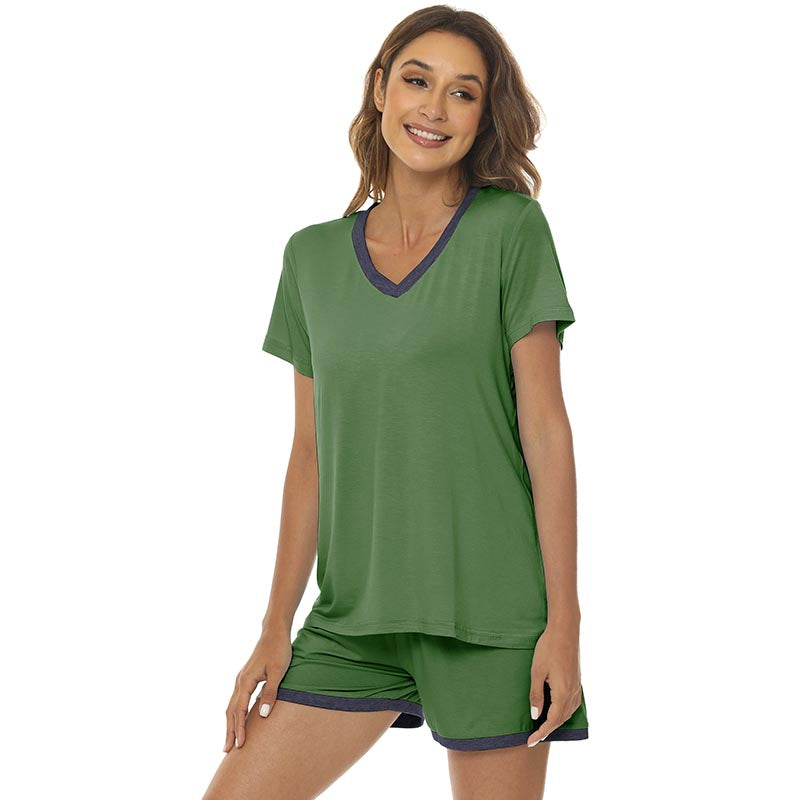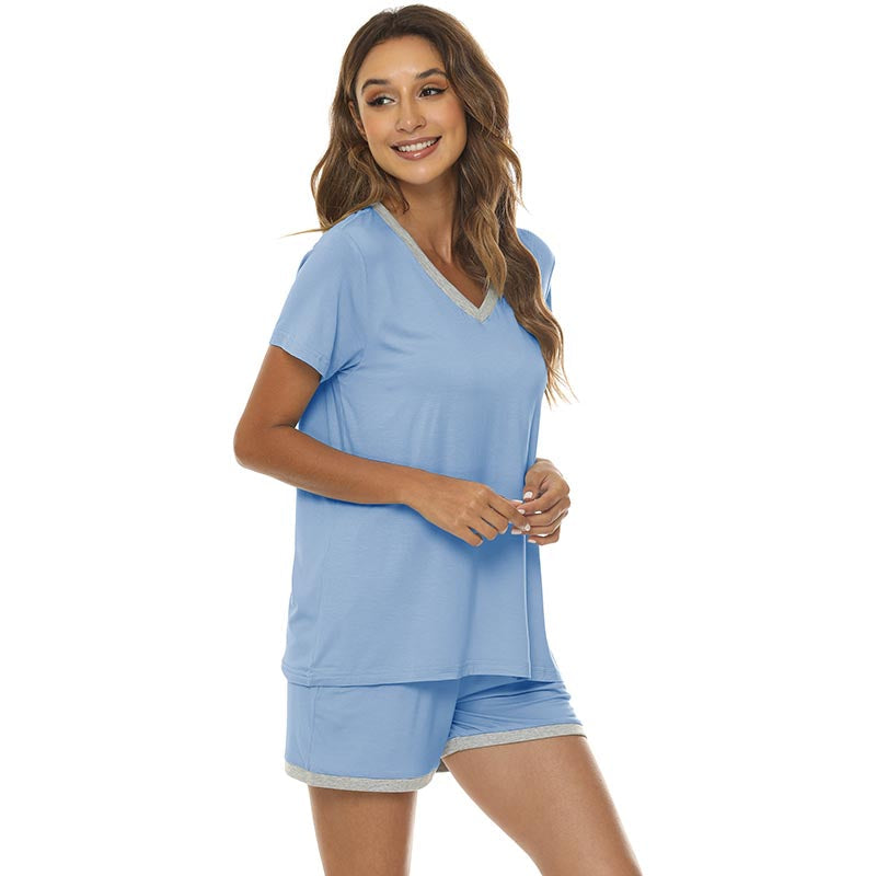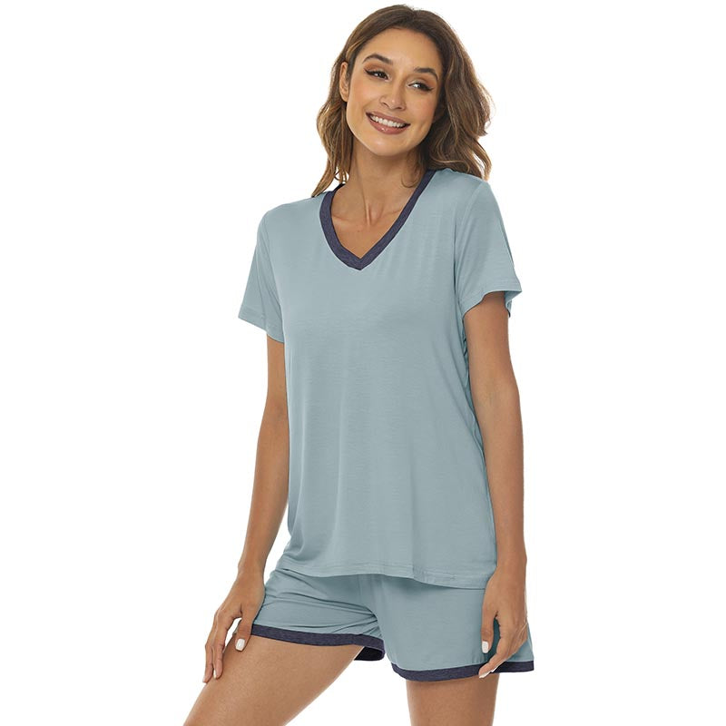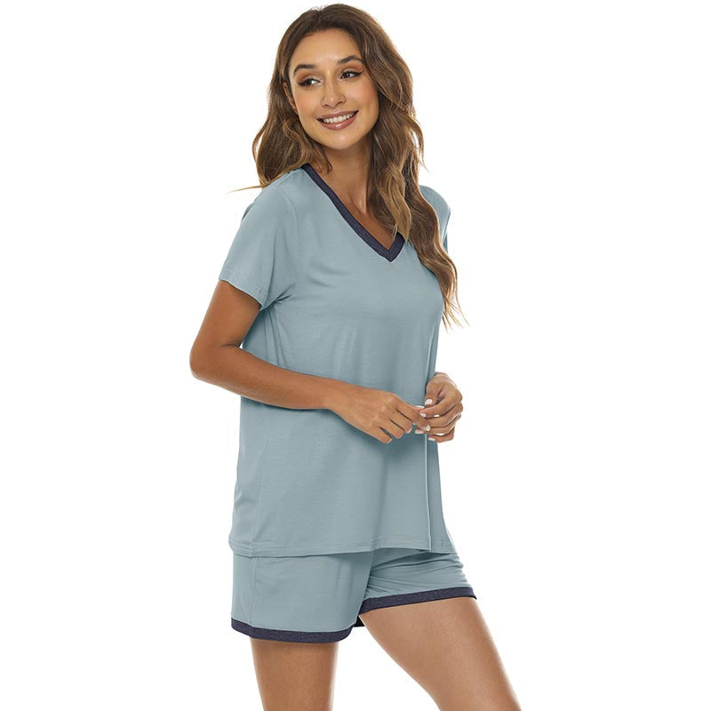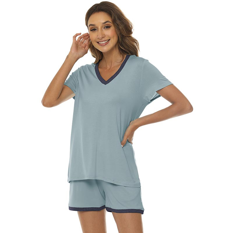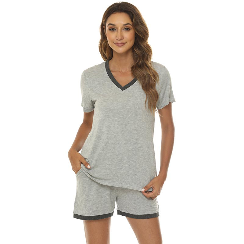 V-neck short sleeve pajama top with elastic waistband solid color capri pant with two pockets.