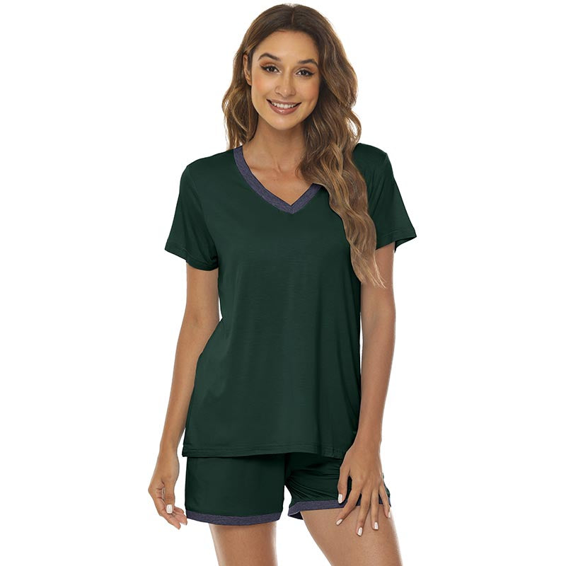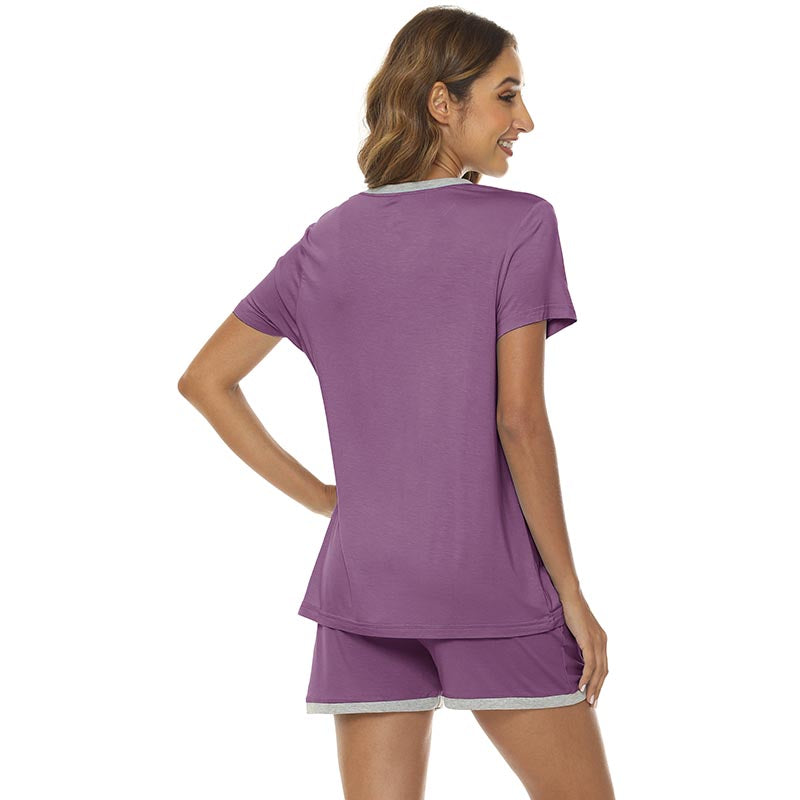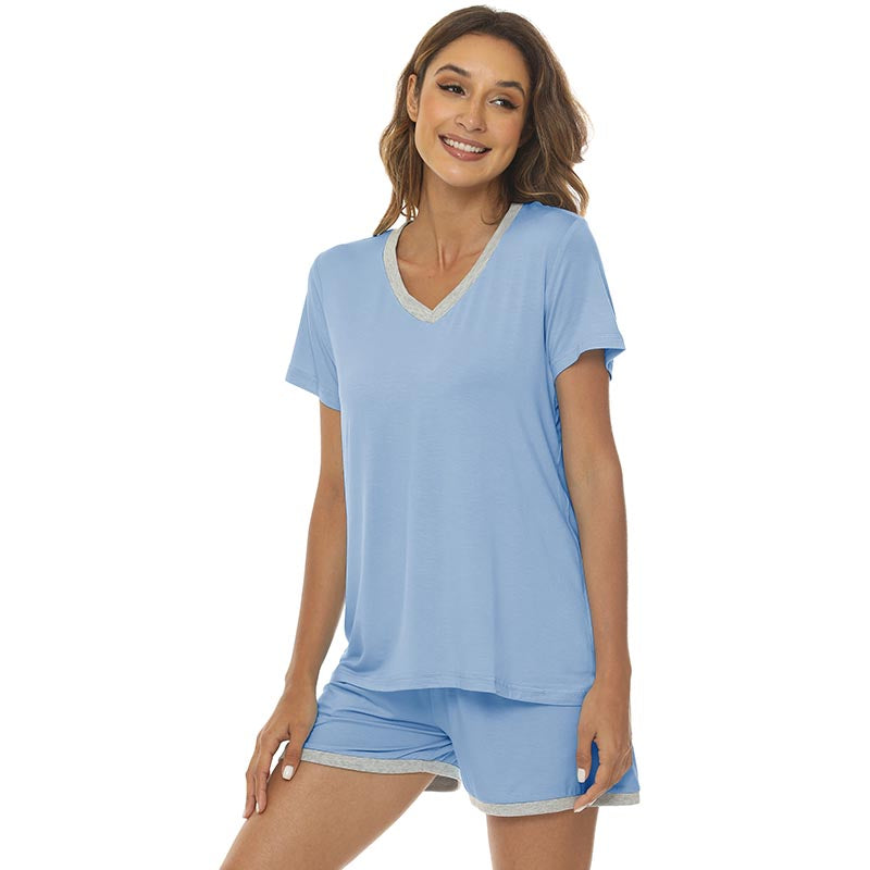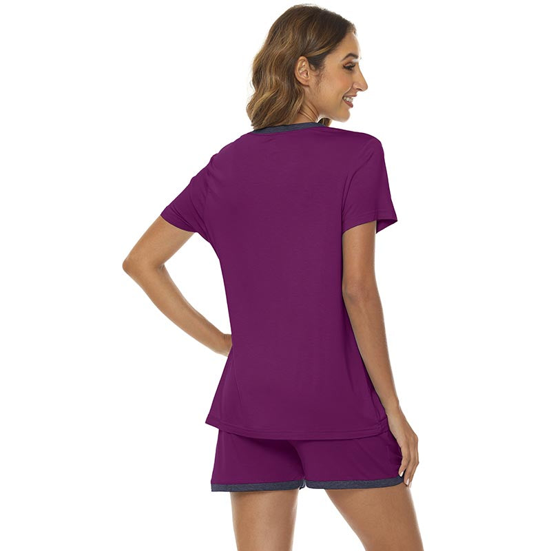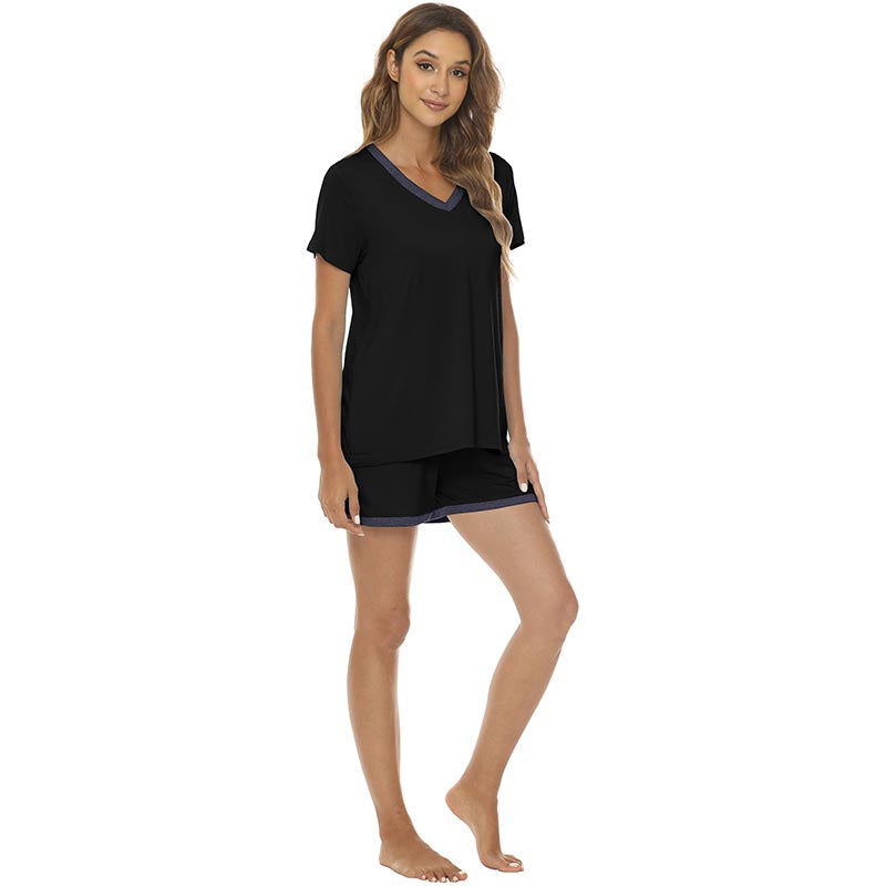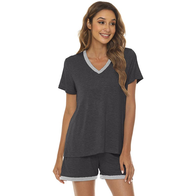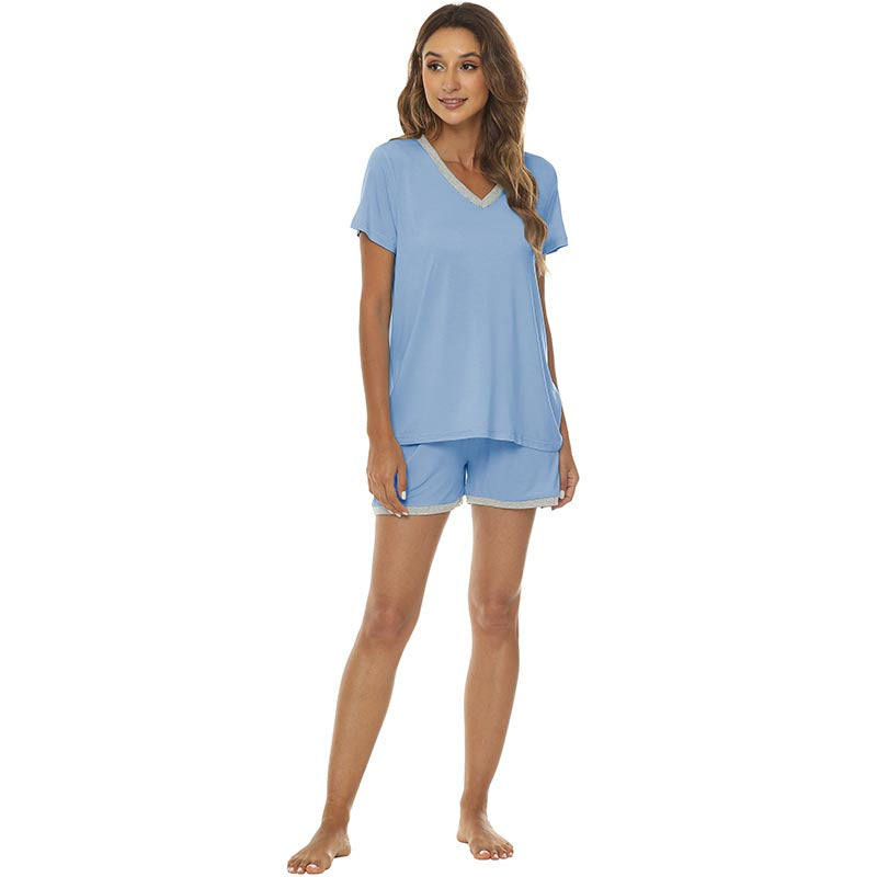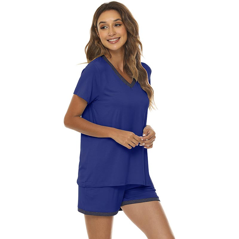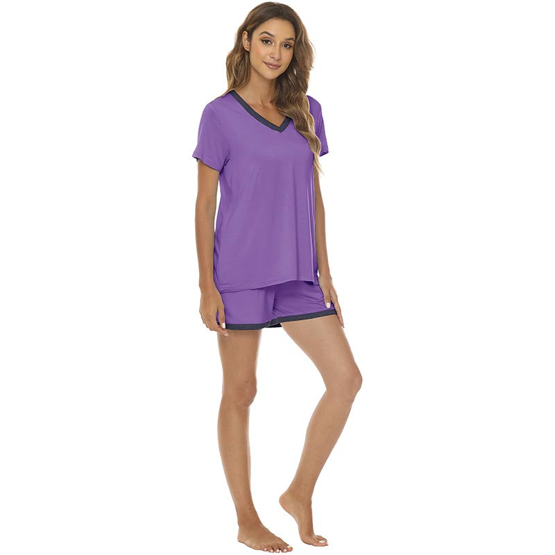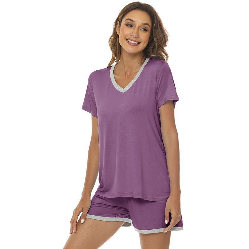 V-neck short sleeve pajama top with elastic waistband solid color capri pant with two pockets.