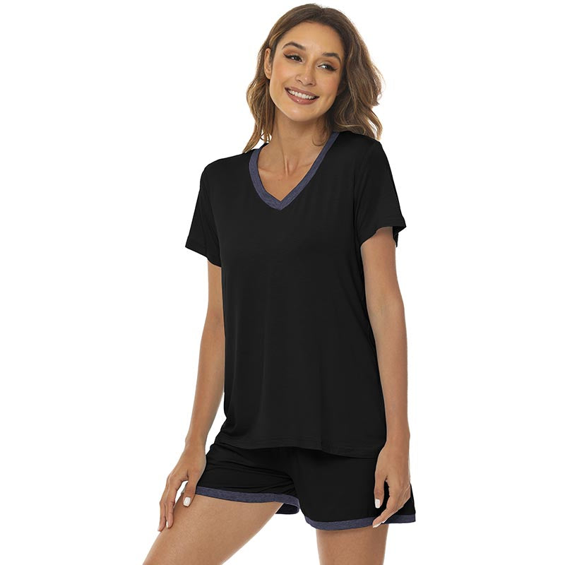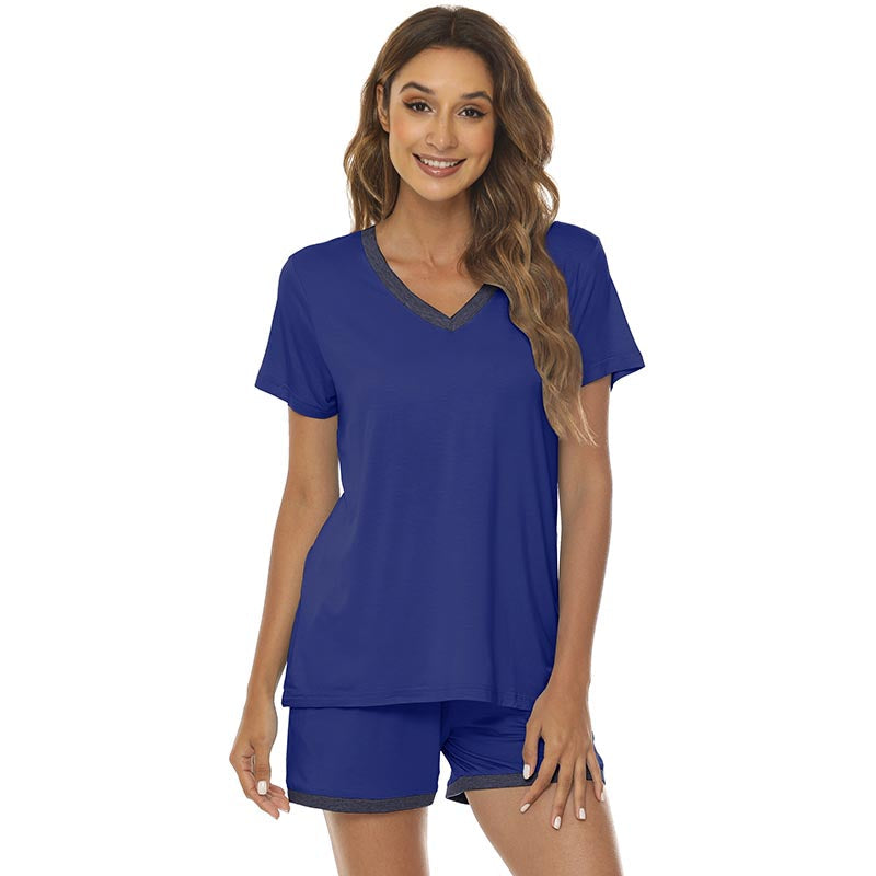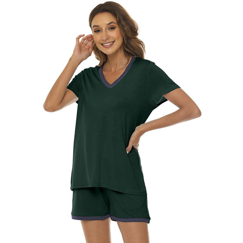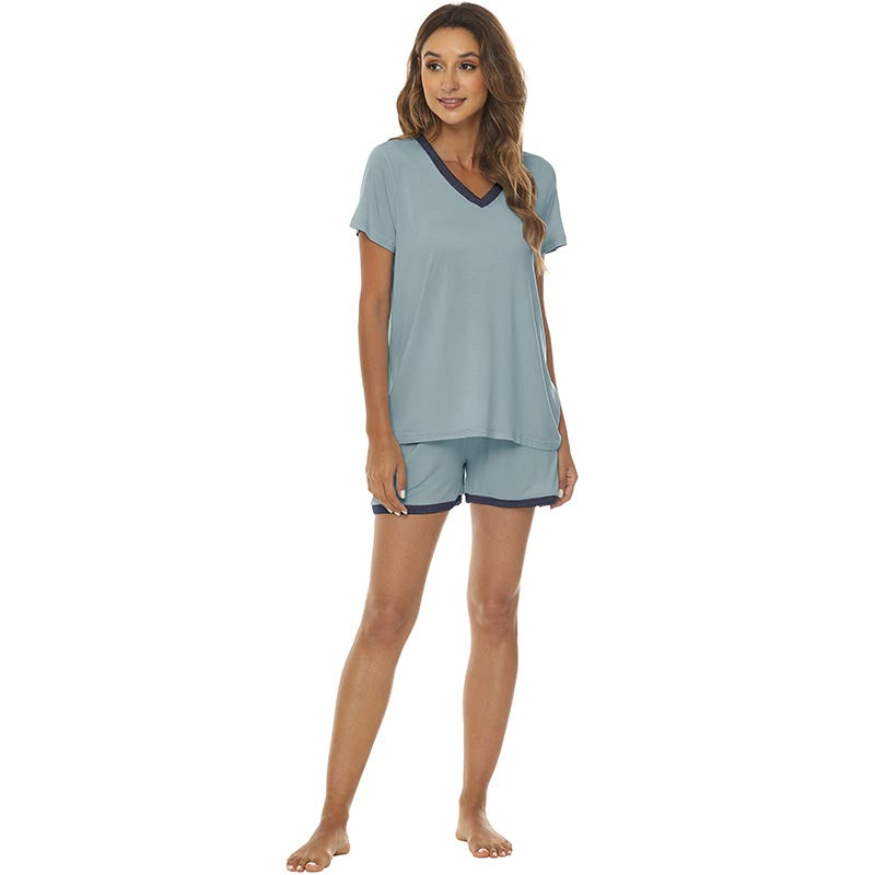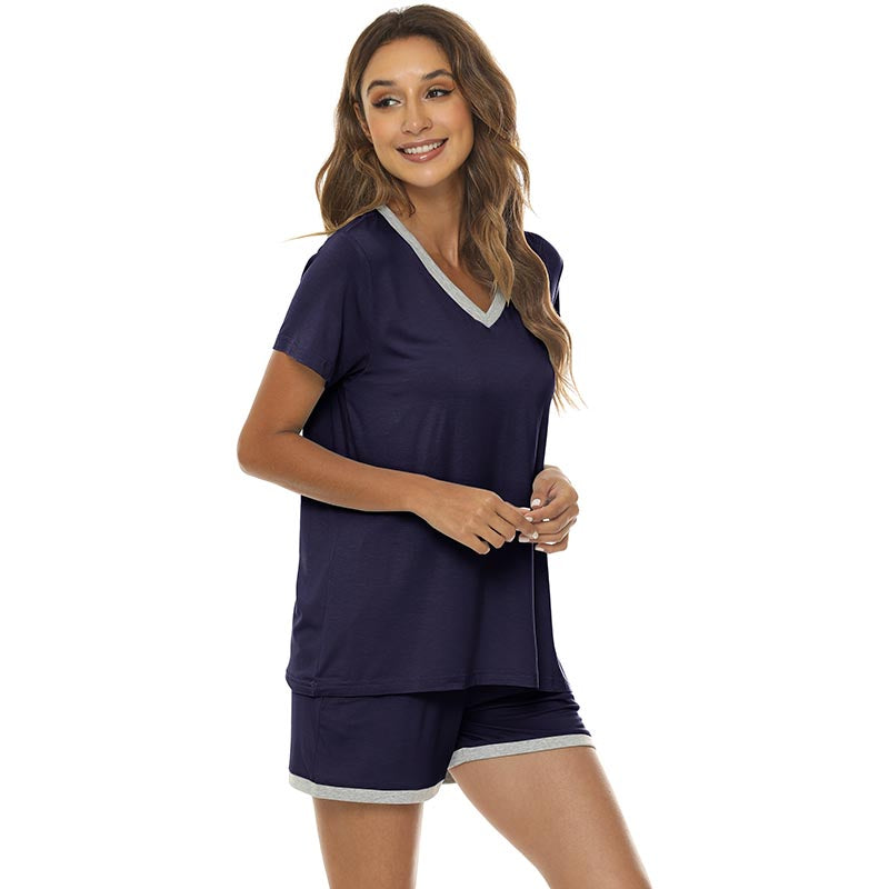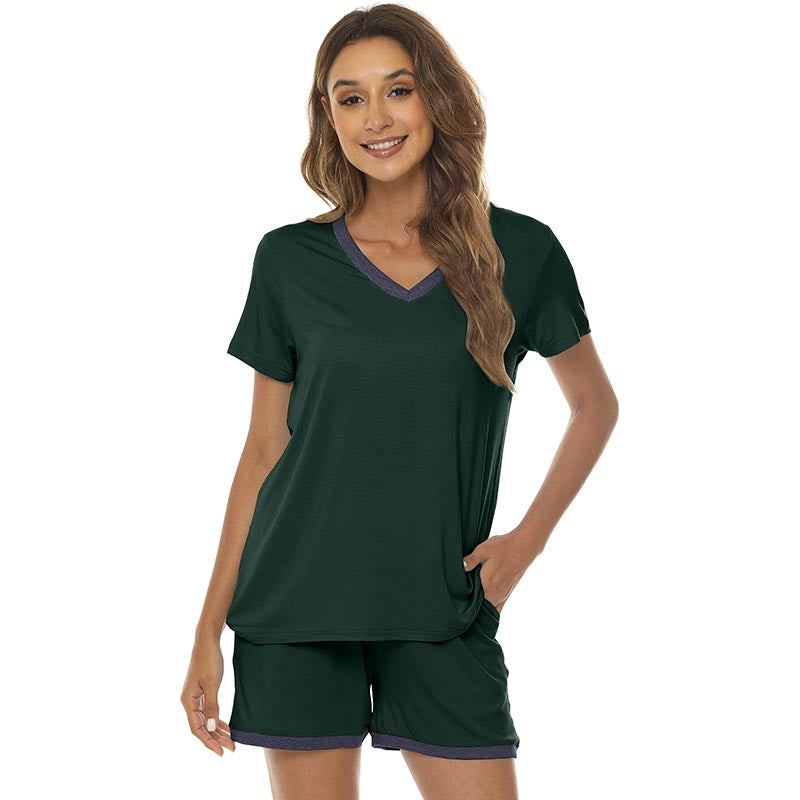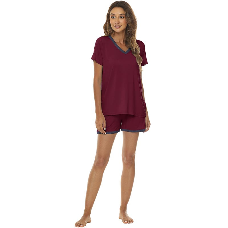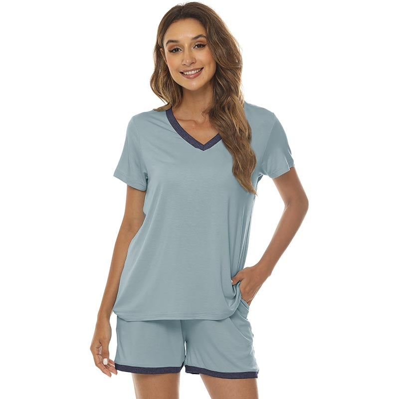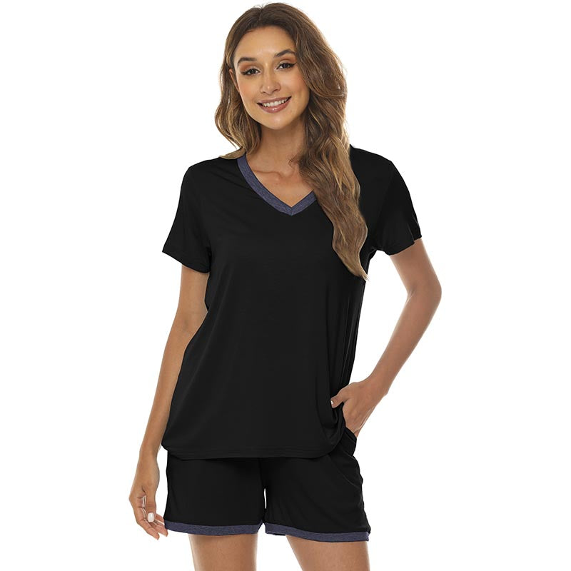V-neck short sleeve pajama top with elastic waistband solid color capri pant with two pockets.