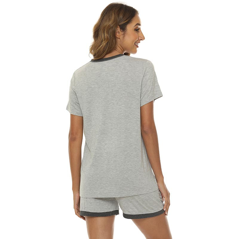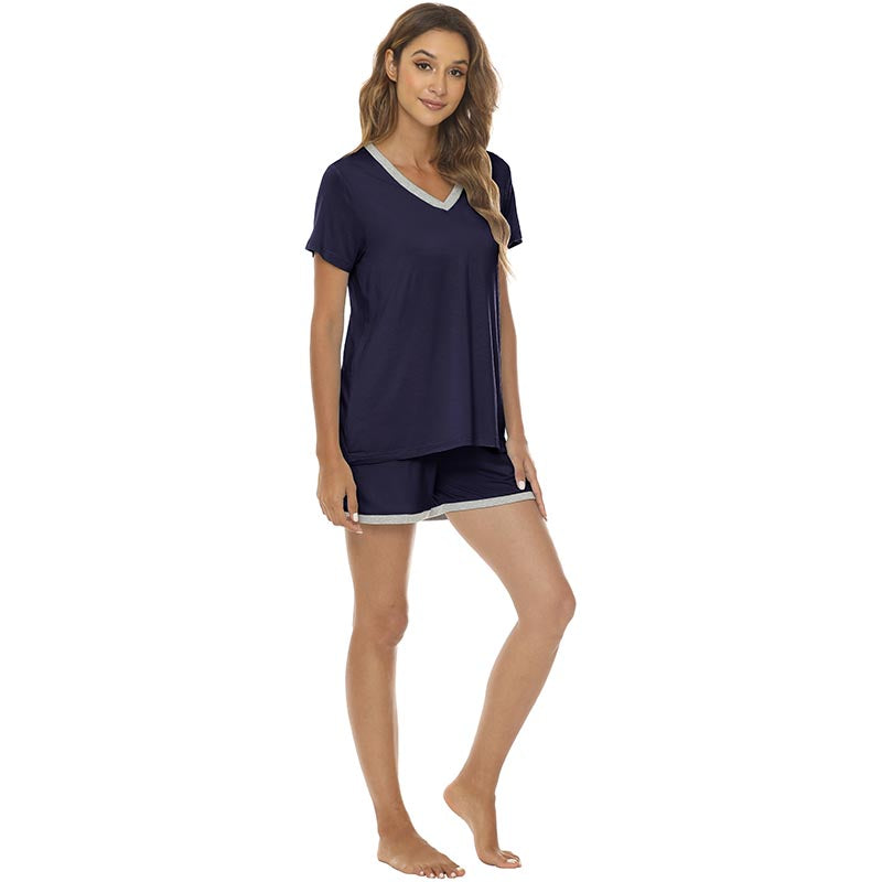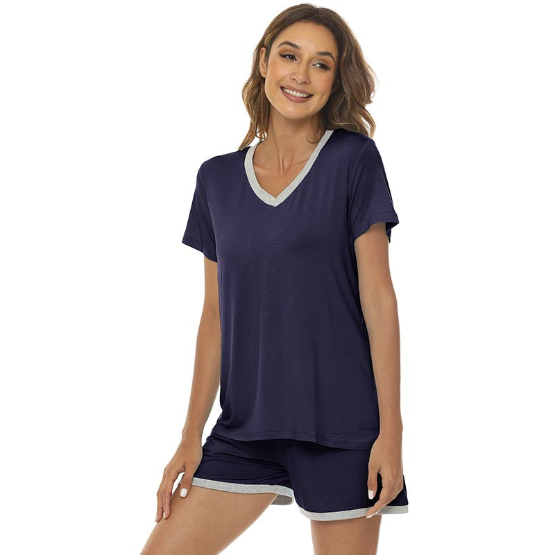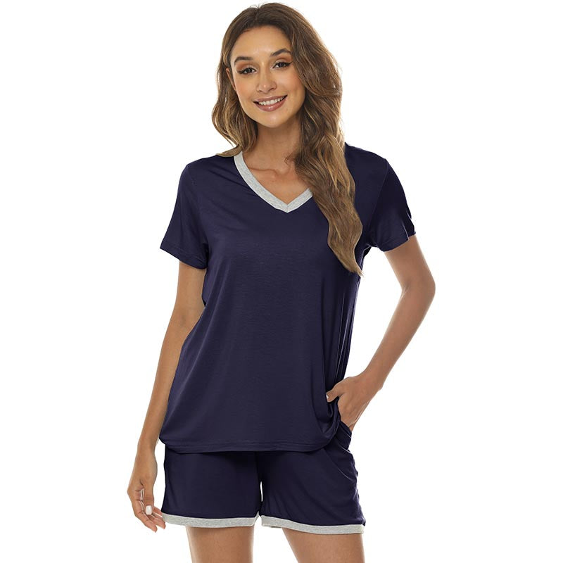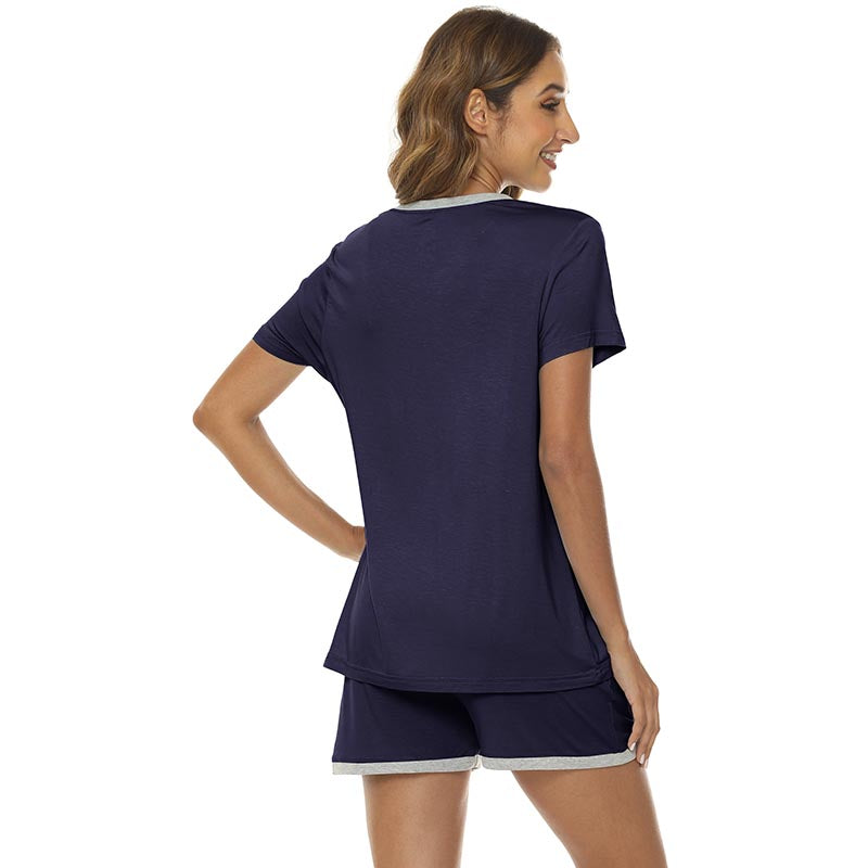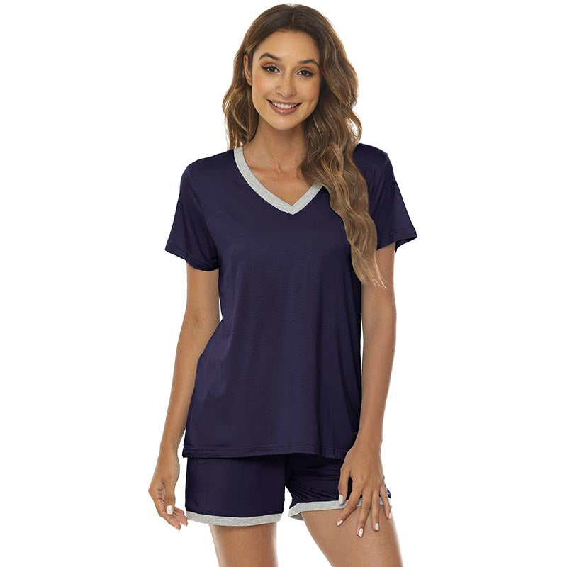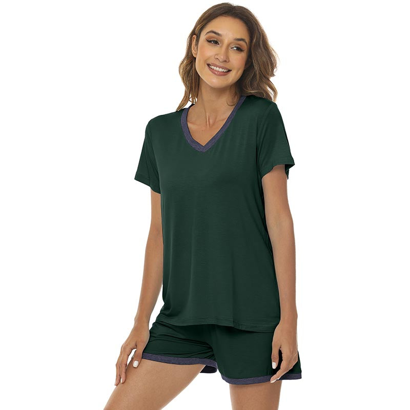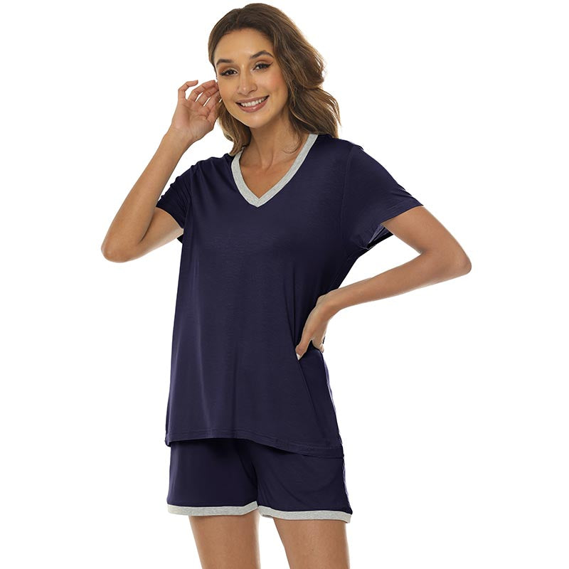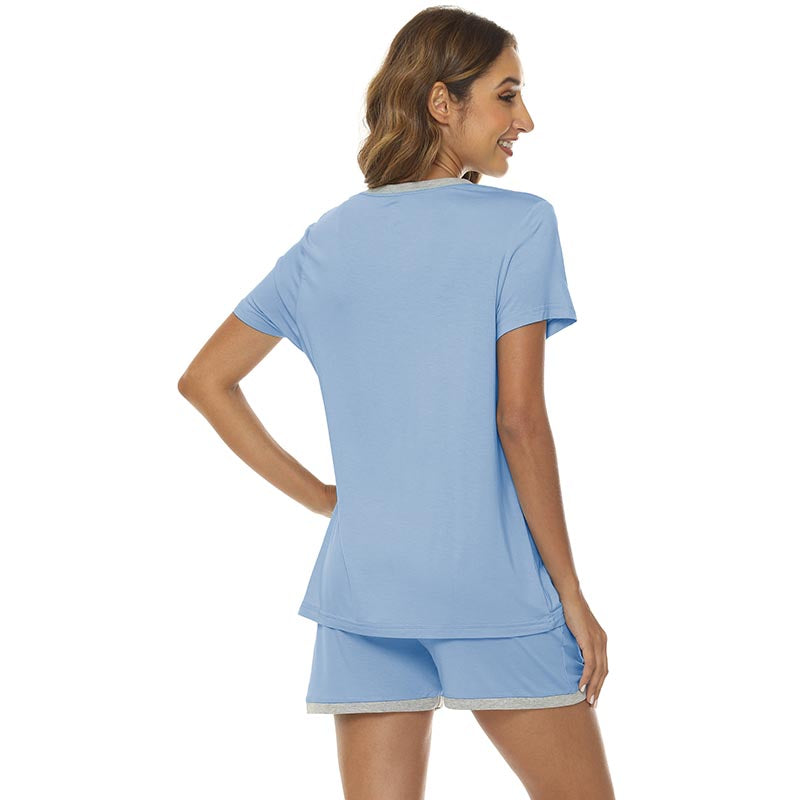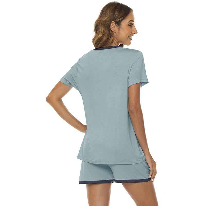 V-neck short sleeve pajama top with elastic waistband solid color capri pant with two pockets.