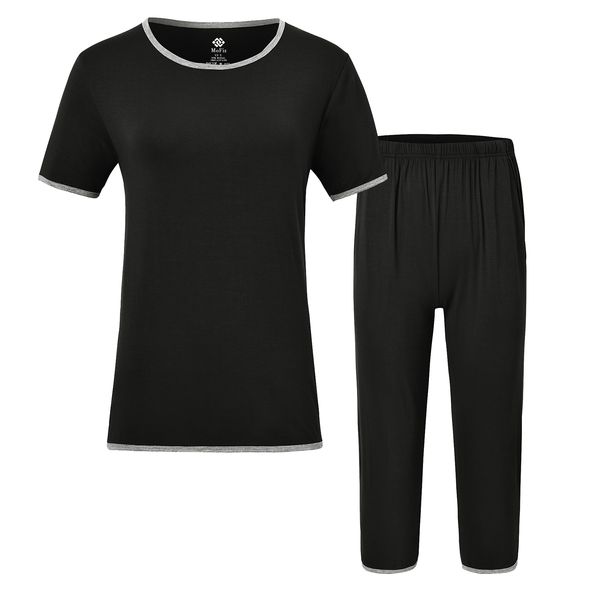 Short sleeve top and 3/4 pajama pants, plaid pants with two side pockets, perfect for your personal belongings. Pants with elastic drawstring for a relaxed